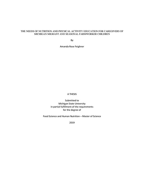 "Migrant and seasonal farmworker (MSFW) children have high rates of overweight and obesity, which can lead to health issues through childhood and adulthood. Caregivers of young children have the ability to influence environment and role model behaviors related to nutrition and physical activity for children. Migrant and Seasonal Head Start (MSHS) programs serve young MSFW children by providing a venue for nutrition and physical activity promotion for extended hours with the ultimate goal of helping at-risk children succeed. We also reported high prevalence of obesity and overweight among MSHS children's caregivers, i.e., parents and MSHS staff. This situation provides important educational opportunities to apply social cognitive theory and policy, systems, and environmental change approaches in order to meet the needs of caregivers (parents and MSHS staff) who can become competent to practice healthy lifestyles for family and MSHS children. In developing nutrition and physical activity education programs targeting caregivers of Michigan MSHS children, this study aimed to identify the perceived needs for content, facilitators and barriers to participating such programs. Of 17 total MSHS centers in Michigan, five of the largest sites were selected for recruitment of MSHS program parents and staff. Twelve focus groups were conducted between July and September 2016 with staff (n = 27), parents (n = 33), and MSHS center directors (n = 13). Focus groups with the consented parents were conducted at MSHS sites in Spanish, with staff in English, and with directors at a central office meeting. Using censuses coding among three researchers, key themes were identified. Quantitative surveys were conducted in parallel to this qualitative study with parents (n = 135) at nine centers and staff (n = 280) at all 17 MSHS centers in Michigan between July-August 2016.We found that desired content for programs included basic nutrition knowledge, cooking and meal planning, physical activity, and budgeting. Facilitators and barriers to participation in a new nutrition and physical activity program included program structure, financial support, education format, and motivation factors. Nutrition education interventions for parents and staff need to be combined with efforts to improve their children's health. We generated key information that can be used in planning future interventions for caregivers of MSHS children. Caregivers who are competent in nutrition and physical activity knowledge may be able to influence the environment and behaviors of their children and MSHS community to promote healthy lifestyles."--Page ii.