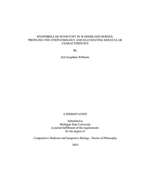 "Myofibrillar myopathy (MFM) is a protein aggregate disease that causes degeneration and loss of function of skeletal muscle and sometimes cardiac muscles. The clinical signs of this disease in people are heterogenous and can include distal limb weakness, atrophy, myalgia, loss of mobility, cardiomyopathy, and respiratory compromise. Approximately half of MFM cases have heritable etiologies that range from dominant to recessive. As many as eight genes have been found to cause MFM and eight additional genes have been implicated in protein aggregate myopathies similar to MFM. Classically, MFM is a progressive late onset disease affecting adults; however, juvenile forms do occur. Currently, there is no treatment for MFM. Research into the pathogenesis and potential treatments of MFM, as a whole, can be difficult due to variation in genetic causes, potential for environmental triggers, and disparity in clinical signs among patients. As a complex disease, a naturally occurring animal model may offer a unique perspective into the mechanisms of protein aggregation in skeletal muscle and present the opportunity for translational medicine and research. MFM has been diagnosed in Warmblood (WB) horses based on the hallmark features of MFM in skeletal muscle: ectopic aggregation of a cytoskeletal protein called desmin coupled with myofibrillar disarray. WB with MFM were previously thought to have a glycogen storage disease and were placed on a recommended diet and exercise program to help manage horses with polysaccharide storage myopathies. However, recent studies found that WB diagnosed with type 2 polysaccharide storage myopathy (PSSM2) did not have elevations in skeletal muscle glycogen. This finding led to the immunohistochemical staining for desmin and MFM diagnosis. It was unknown whether a diet recommended for a glycogen storage disease was beneficial for PSSM2 and MFM WB. Furthermore, the etiopathology of WB MFM was undetermined. The overarching objective of this dissertation is to evaluate the responses of PSSM2/MFM WB to the recommended polysaccharide storage myopathy diet (PSSM) and further elucidate the etiopathology of MFM in WB by identifying candidate genes, proteins, and pathways that drive aberrant cellular responses and disease pathology. The first study used a retrospective questionnaire to determine owner perceived symptoms and responses of PSSM2/MFM WB to the PSSM diet. We determined that PSSM2/MFM WB had a decline in athletic performance and a reluctance to engage their muscles during work. Furthermore, we confirmed that PSSM2/MFM WB do not have elevations in skeletal muscle glycogen. The second study of this dissertation took a candidate gene approach to look for differential expression (DE) and coding sequence variants in 16 candidate MFM genes in MFM and non-MFM WB. Our results found there was no DE of the candidate genes and that no variants associated with the MFM disease phenotype. We next used transcriptomic and proteomic profiling to detect DE genes and proteins in MFM WB. Through pathway enrichment, we identified the Z-disc, mitochondrial complex I, and the extracellular matrix as key cellular components in MFM etiopathology. The identified new candidate genes and proteins using this multi-omic approach may serve as future diagnostic markers for MFM in WB. Overall, our results suggest MFM WB have aberrant Z-disc mechanosignaling resulting in sarcomere instability, which is further confounded by impaired redox homeostasis."--Pages ii-iii.