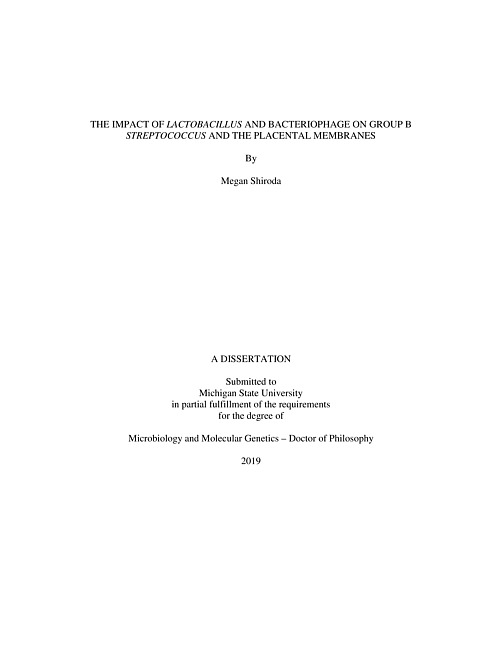 The human microbiota encompasses the microbes that live on and in the human body. While some body sites including the vaginal and intestinal tracts have been studied extensively for their role in human health, other body sites have been historically considered sterile and are less studied. One such site is the placental membranes that surround the fetus during pregnancy and serve as an important protective barrier during pregnancy. Several studies have established which bacteria are found in this site, but few studies have been conducted to characterize their interactions in vitro or to understand their impact on the placental membranes. Further, our knowledge of the viral component of the microbiome in human health remains incomplete.In this dissertation, Lactobacillus, a well-studied probiotic in other body sites, was evaluated for its effect in the placental membranes. As these membranes were previously considered sterile, we sought to assess the ability of Lactobacillus to colonize these cells and evaluate its impact on them. A cell line model of the outermost layer of these membranes, the decidual cells, was used to establish that Lactobacillus can associate and impact a known cell signaling pathway, the Mitogen Activated Protein Kinase (MAPK) pathway, which is associated with inflammation and host cell death. Total protein level of p38, an important upstream protein in this pathway, was found to be significantly lower with Lactobacillus than in mock infection. These data suggest that Lactobacillus could maintain a commensal interaction in the placental membranes as described in other body sites. Lactobacillus is also known to inhibit pathogen invasion. Group B Streptococcus (GBS) can ascend from the vaginal tract to infect placental membranes, triggering premature birth or neonatal infection. Four Lactobacillus strains representing three species were characterized to assess their impact on two GBS strains (colonizing and invasive). We found live Lactobacillus does not affect GBS growth or biofilm production. L. gasseri increased association of both strains of GBS to the decidual cells but did not result in increased invasion of the cells. Instead, co-culture with Lactobacillus reduced host cell death. Secreted products of Lactobacillus drastically reduced growth in 35 GBS strains that broadly represent GBS diversity and could prevent biofilm formation; this inhibition was strain dependent. Unfortunately, increased GBS-induced host cell death with Lactobacillus supernatants was observed. Collectively, these data suggest that both live Lactobacillus and its supernatant could impact GBS interactions with the placental membranes.Bacteriophage are one of the most abundant members of the microbiome but their impact on opportunistic pathogens such as GBS remains unknown. As GBS can be isolated from gastrointestinal tract, we hypothesized fecal phage communities would inhibit the growth of GBS in vitro. Approximately 6% of the tested communities inhibited the growth of 35 GBS strains. To better understand differences in GBS strain inhibition, we examined capsule, sequence and clinical types of the strains. As no significant differences were found with these traits, we next examined Clustered Regularly Interspaced Palindromic Repeats (CRISPR), which serve as an adaptive immune system against invading foreign DNA by the acquisition of spacer sequences. GBS strains with fewer than nine spacer sequences were less likely to be lysed by a phage community than strains with more than sixteen spacers. We further hypothesized that presence of GBS in the corresponding bacterial component of each phage community would correlate to its ability to inhibit GBS growth. While this correlation did not exist across all GBS strains tested, sensitive strains of GBS were significantly more likely to be inhibited by phage communities with a lower abundance of GBS. Collectively, these data suggest that the phage component of the intestinal microbiome could impact GBS colonization. To further characterize these interactions, an individual bacteriophage should be isolated from these communities.