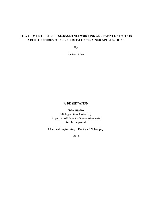 "In this dissertation thesis, we develop a scalable and energy-efficient discrete-pulse-based networking architecture along with a Spiking-Neuron-based low-power detection framework for use in resource-constrained settings. Applications such as Structural Health Monitoring (SHM) using wireless sensor networks powered by ambient energy harvesting are particularly suited for such a framework. The key idea in pulse-based networking is to eschew unnecessary overhead as incurred in traditional packet-based networking and encode only the essential information using small number of discrete pulses and their positions with respect to a synchronized time frame structure. The baseline pulse networking does not scale well with increase in network size. In order to ameliorate this, we develop a scalable time frame structure for use in applications with large network size while preserving the energy advantages of pulse networking. In addition, we stress the importance of judicious use of erratic energy availability in ambient energy harvesting powered systems. To that effect, we build energy-awareness syntaxes within the pulse networking framework for better utilization of energy resources in such systems. We also demonstrate the feasibility of pulse networking over a through-substrate ultrasonic link layer and the advantages thereof in terms of utilizing existing infrastructure and removing the need for radio retrofits. We explore how the protocol performance varies for an airplane stabilizer monitoring application powered by ambient vibration energy harvesting in different energy availability scenarios. Beyond this, we also develop a Spiking-Neuron-based low-power event pattern detection architecture and illustrate how this can be incorporated within a pulse-networked SHM system. The Spiking Neuron based architecture is evidenced to be simpler in terms of implementation but more efficient in terms of computation and energy usage, thus enabling in-situ detection even at intermediate nodes in the network and robust low-power event pattern detection immune to pulse drifts and errors."--Pages ii-iii.
