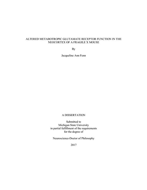 Fragile X Syndrome (FXS) is the leading cause of inherited intellectual disability. It is characterized by a wide array of symptoms, including cognitive impairments, attention deficit and hyperactivity disorder (ADHD), hypersensitivity to sensory stimuli, autistic features, mood lability, and seizures. Since the creation of the Fmr1 KO mouse more than 20 years ago, a wealth of studies have uncovered a role for group I metabotropic glutamate receptors (mGluRs) in mediating many FXS phenotypes, leading to development of "The mGluR Theory of Fragile X". However, studies supporting this theory have focused on impairments in the hippocampus, amygdala, and other structures of the allocortex. The isocortex remains largely uninvestigated, despite its major role in sensory integration, attentional processes, and executive function. MgluRs are also highly expressed in the neocortex, where they can modulate neuronal excitability and synaptic transmission. Using electrophysiological methods, I investigated the role of group I and group II mGluRs in modulating neocortical circuits in primary visual cortex. Humans with FXS show severe visual-motor deficits, and perform poorly on global motion tasks. Autopsy studies also reveal abnormal dendritic spine morphologies in layer 5/6 of the visual neocortex, and this is substantiated in the Fmr1 KO mouse. Using whole cell patch clamp recordings of different neuron subtypes in layer 5/6 of primary visual cortex, I found that Fmr1 KO layer 5/6 somatostatin expressing neurons (SST+) have a significant decrease in input resistance compared to wild type (WT), indicating that they are less intrinsically excitable than WT SST+ neurons. Further, I show that activation of group II mGluRs leads to disinhibition of excitatory pyramidal neurons. I also discover that suppression of GABAergic transmission by group II mGluRs is normal in the Fmr1 KO, leading to my hypothesis that increased disinhibition of pyramidal neurons by group II mGluRs is due to their altered modulation of fast glutamatergic transmission onto layer 5/6 interneurons in the Fmr1 KO mouse. Using recordings from fluorescently labeled interneurons in layer 5/6 visual neocortex, I discover that group II mGluR-mediated suppression of fast excitatory glutamatergic transmission onto inhibitory neurons is exaggerated in the Fmr1 KO mouse. I show that this effect is cell specific, as it only occurs in SST+ interneurons and not parvalbumin expressing interneurons. Finally, I show that this deficit in excitatory drive onto SST+ interneurons is mediated by presynaptic mGluRs, and that these defects are specific to layer 5/6 visual neocortex. Both the decreased excitability of SST+ interneurons and exaggerated group II-mGluR mediated suppression of excitatory drive onto these cells would lead to neocortical circuit hyperexcitability in the Fmr1 KO mouse. A hyperexcitable neocortical circuit would be anticipated to negatively impact sensory integration, a requirement for both stimulus encoding and attentional processes. Lastly, a hyperexcitable neocortical network could give rise to epileptiform activity. The results of these studies are fascinating, as group II mGluRs have not previously been implicated in studies of the neocortical pathogenesis in the Fmr1 KO mouse. This investigation also showed that group I mGluR-mediated modulation of membrane excitability and fast synaptic transmission is unaltered in the Fmr1 KO mouse, suggesting that "The mGluR theory of Fragile X" may in fact be more or less valid contingent on the brain region under investigation. It is my hope that these circuit studies will inform scientific investigations on autism spectrum disorders and epilepsy syndromes, as both show high comorbidity in individuals with FXS.