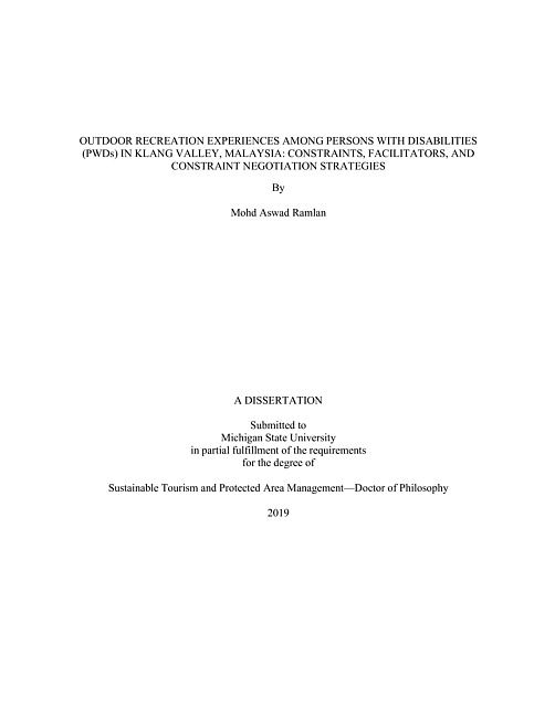 Outdoor recreation experiences among persons with disabilities (PWDs) in Klang Valley, Malaysia : constraints, facilitators, and constraint negotiation strategies