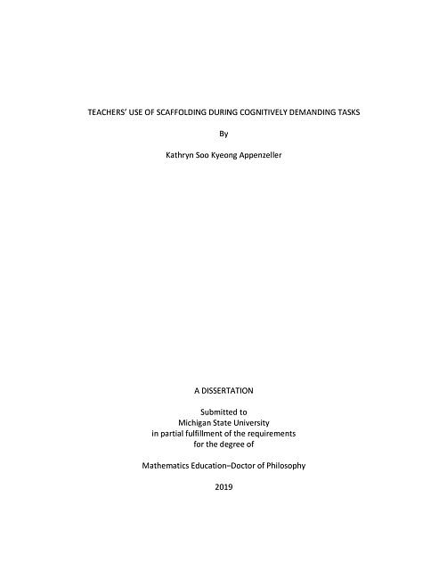 Researchers argue that scaffolding students' mathematical thinking is an effective teaching practice (Calder, 2015; Mercer & Littleton, 2007; Roll, Holmes, Day, & Bonn, 2012) that supports students when they need additional assistance to complete a task (Wood, Bruner, & Ross, 1976). Others demonstrate the importance of enacting cognitively demanding tasks because they help build students' capacity for mathematical reasoning (Stein, Grover, & Henningsen, 1996) and are critical to students' achievement and learning (Charalambous, 2008; Hiebert & Wearne, 1993; Stein & Lane, 1996). Recent literature identifies a connection-and at times a tension-between scaffolding and cognitive demand (Sullivan & Mornane, 2014).For this dissertation, I conducted an empirical study that included classroom observations and semi-structured teacher interviews to address a gap in research by asking the following research questions within the context of cognitively demanding tasks: 1) How do teachers think about the relationship between scaffolding and maintaining cognitive demand?, 2) In what ways do teachers provide scaffolding through discourse? and 3) What are students' experiences and in what ways do teachers respond to students' experiences?I analyzed teachers' discourse, specifically teacher questions and prompts, during the teachers' enactment of the Connected Mathematics Project (CMP) curriculum and teacher interviews. In this work, teachers voiced their struggle of providing appropriate scaffolding without reducing the cognitive demand of tasks. I used curriculum (lesson phases and focus questions), student uncertainty, and student frustration as contexts to illustrate how the participating teachers mediated tension between scaffolding and cognitive demand. Drawing from teachers' strategies, largely teacher discourse, I developed a teacher question framework that described the nature of unfolding teacher questions that encouraged student exploration and conceptual learning.Instead of fading, teacher scaffolding changed to reflect the contexts mentioned above while maintaining cognitive demand. My findings provide insights for professional development on enacting cognitively demanding tasks.