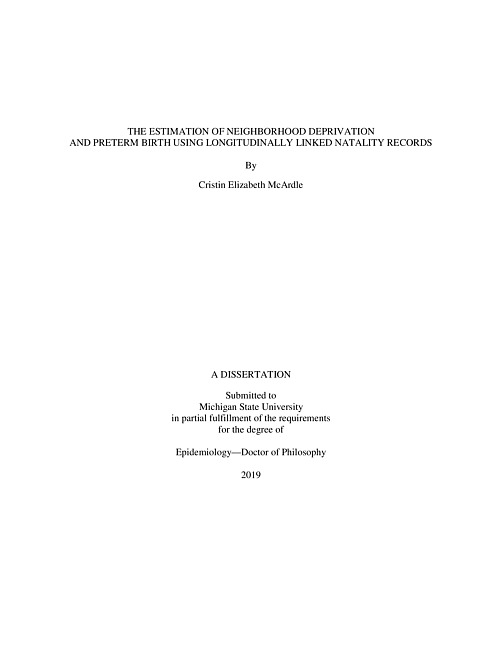 This dissertation examined the association between neighborhood-level deprivation and perinatal outcomes. We studied the association between neighborhood poverty rate and pre-term birth (PTB; birth < 37 weeks) using longitudinal maternally-linked natality files of women and their infants in Michigan during the period 1990-2012. This study examined the embodiment of place and role of maternal characteristics during pregnancy in an effort to understand how selection into neighborhood may bias our understanding of neighborhood level associations. We looked at pregnancy outcomes across multiple pregnancies for the same woman (the mother) as she changed neighborhoods, and levels of poverty between pregnancies. In the first study examining residential mobility between pregnancies, we reported that approximately half of our sample changed residences between pregnancies. We further exploited our data structure to examine the association with prior PTB on subsequent mobility in two sub-samples restricted by parity: births 1 and 2, and births 2 and 3. We found the strongest risk factors for mobility were related to marital change (Divorce: births 1 to 2 OR: 2.5 95% CI: 2.4-2.6, births 2 to 3 OR: 3.3, 95% CI: 3.1-3.6); Married: births 1 to 2 OR: 2.8, 95% CI: 2.7-2.8, births 2 to 3 OR: 1.9, 95% CI:1.9-2.0) but not prior PTB (prior PTB: births 1 to 2 OR: 1.0, 95% CI:1.0-1.0, births 2 to 3 OR: 1.1 95%CI: 1.0-1.1). In the second study, we report that most women did not experience a change in the level of neighborhood poverty, based on quartile of neighborhood poverty. Women who remained in the poorest neighborhoods experienced the highest percentage of PTB across two births samples, Births 1 to 2 (11.4% PTB) and Births 2 to 3 (12.3% PTB). We found increased odds of PTB for births 1 to 2 with strong downward neighborhood trajectory (OR 1.2, 95% CI 1.0-1.3) but also increased odds of PTB among strong upward neighborhood poverty trajectory (OR 1.1, 95%CI: 1.1- 1.2) compared to the static trajectory group of lowest neighborhood poverty quartile. In Study 3, we then employed a novel approach, maternal fixed effects, utilizing data linked over time to compare birth outcomes for the same mother under different exposures which allows the mother to act as her own control, analogous to a case-crossover design, while comparing the contextual effects of neighborhood deprivation on PTB. We conducted logistic regression, random effects and fixed effects analysis to evaluate n=2,191,063 eligible births during our study period. Because a fixed effects model relies on variation over time within a mother to identify the estimated association of neighborhood deprivation and PTB, the primary analytic sample was restricted (n=280,277 births to 103,328 women).We found a null association between neighborhood poverty and PTB when using a maternal fixed effects analysis (OR: 1.0, 95% CI: 1.0-1.0). This was one of the first studies to profile the maternal neighborhood mobility patterns over a long period of time, between successive pregnancies and evaluated by neighborhood poverty rate.