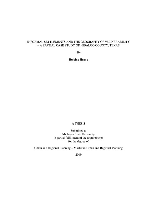 "More than 2,000 colonias and more than 800 model subdivisions have been developed in unincorporated areas across the state of Texas. Since the 1980s, a substantial body of research has documented the poor housing conditions and inadequate infrastructure in these informal settlements in the United States. However, very little research has focused on the geographic vulnerability, such as exposure to environmental risks and the lack of access to amenities. This study adopts two Geographic Information System (GIS) methods (overlay analysis and proximity analysis) to investigate the vulnerability of informal settlements in Hidalgo County, Texas. This research finds that informal settlements experience more spatial vulnerability than formal neighborhoods as they are further away from the urban center, the job center, and other critical amenities. However, the prevalence of property crime in informal settlements is significantly lower. Within the informal settlements, colonias are still in need of basic infrastructures. Besides, this study finds that state-designated colonias are less vulnerable than newer model subdivisions that have developed largely without acknowledgment by the state.These findings suggest the need for state and local governments 1) to make more targeted investments to provide water and wastewater service; 2) to develop public transportation system; 3) to reduce vulnerability by expanding access to amenities or services and 4) to partner with private entities and communities themselves to address the needs in informal settlements."--Page ii.
