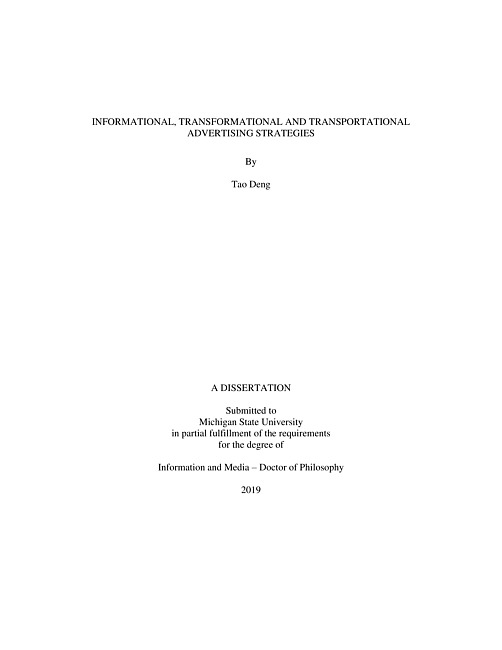 "Traditionally, advertising strategy can be categorized as either informational or transformational. Nonetheless, scholars have proposed a unique pathway to persuasion through narrative transportation but devote little attention to developing its application in advertising, despite its popularity in many forms of advertising today. This dissertation proposes an overlapping model of advertising strategies by adding transportational strategy as an additional strategy that is conceptually different from the informational and transformational strategies. Study 1 of this dissertation tested advertising evaluations of informational, transformational, and transportational strategies using fictional ads focused on one of the three advertising strategies for two medium involvement products. Findings of study 1 indicate that a transportational strategy yields more positive results than the other two strategies in terms of ad attitude, brand attitude and purchase intention. Study 2 further compared ads that focused on one particular strategy with ads that used a mix of different strategies. Findings indicate that ads with a focused strategy result in more positive outcomes than ads with mixed strategies in terms of ad and brand attitude and purchase intention. Finally, study 3 tested a transportation mediation framework using critical thoughts and affective responses as mediators in real-world video ads created by large global brands. Findings show that the addition of critical thoughts and affective responses as mediators significantly increases the model's explanatory power."--Page ii.