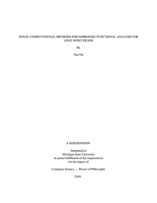 "Single-molecule, real-time sequencing (SMRT) developed by Pacific Biosciences (PacBio) and Nanopore sequencing developed by Oxford Nanopore Technologies (Nanopore) produce longer reads than second-generation sequencing technologies such as Illumina. The increased read length enables PacBio sequencing to close gaps in genome assembly, reveal structural variations, and characterize the intra-species variations. It also holds the promise to decipher the community structure in complex microbial communities because long reads help metagenomic assembly. However, compared with data produced by popular short read sequencing technologies (such as Illumina), PacBio and Nanopore data have a higher sequencing error rate and lower coverage. Therefore, new algorithms are needed to take full advantage of third-generation sequencing technologies. For example, during an alignment-based homology search, insertion or deletion errors in genes will cause frameshifts, which may lead to marginal alignment scores and short alignments. In this case, it is hard to distinguish correct alignments from random alignments, and the ambiguity will incur errors in the structural and functional annotation. Existing frameshift correction tools are designed for data with a much lower error rate, and they are not optimized for PacBio data. As an increasing number of groups are using SMRT, there is an urgent need for dedicated homology search tools for PacBio and Nanopore data. Another example is overlap detection. For both PacBio reads and Nanopore reads, there is still a need to improve the sensitivity of detecting small overlaps or overlaps with high error rates. Addressing this need will enable better assembly for metagenomic data produced by the third-generation sequencing technologies.In this article, we are going to discuss the possible method for homology search and overlap detection for the third-generation sequencing. For overlap detection, we designed and implemented an overlap detection program named GroupK. GroupK takes a group of short kmer hits, which satisfy statistically derived distance constraints to increase the sensitivity of small overlap detection. For the homology search, we designed and implemented a profile homology search tool named Frame-Pro based on the profile hidden Markov model (pHMM) and consensus sequences finding method. However, Frame-pro is still relying on multiple sequence alignment. So we implemented DeepFrame, a deep learning model that predicts the corresponding protein function for third-generation sequencing reads. In the experiment on simulated reads of protein-coding sequences and real reads from the human genome, our model outperforms pHMM-based methods and the deep learning based method. Our model can also reject unrelated DNA reads and achieves higher recall with the precision comparable to the state-of-the-art method."--Pages ii-iii.
