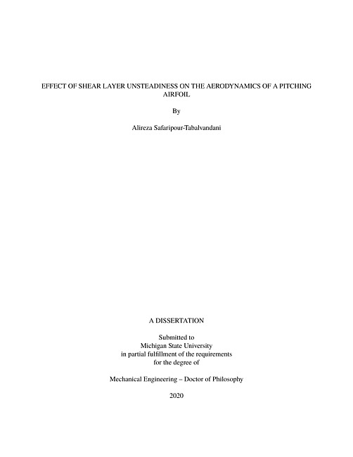 It is common practice to utilize a uniform approach flow in most of the problems in aerodynamics. However, in numerous circumstances the complex approach flows found in nature can be significantly non-uniform and even include spatially non-uniform temporal fluctuations. Motivated by these non-uniform unsteady flows, this experimental study investigates the effects of non-uniform approach flow unsteadiness on the aerodynamic performance of an airfoil.To isolate the effects of unsteadiness from those of the mean non-uniform approach flow, two non-uniform (shear) flows with a matching mean velocity profile are generated in a water tunnel facility. One of these profiles is made through a canonical two-stream shear layer, which is known to contain vortical structures and exhibit non-uniform velocity fluctuations. A matching shear velocity profile with uniform low level fluctuations is generated utilizing a modified shaped honeycomb shear generation method based on the original model proposed by Kotansky (1966). These shear flows demonstrate the same mean behavior and only differ in their fluctuation profiles.Behavior and development of both shear flows are examined through measurements of their streamwise velocity profile at multiple downstream locations utilizing single component molecular tagging velocimetry. The steady and unsteady shear flows are found to produce the same mean velocity profile with different classes of velocity fluctuations. The steady shear flow demonstrates a uniform low level of fluctuating velocity profile while the unsteady shear layer velocity fluctuations mimic the signature fluctuating velocity profile of plane mixing layers, with a high level of fluctuations in the center and a gradual decrease in fluctuations moving away from the shear layer center line.A NACA0012 airfoil is positioned at the center of each shear flow and the average aerodynamic forces on the stationary airfoil are directly measured across a wide range of angles of attack. The resulting lift and drag coefficient curves are compared for each of these shear flows as well as the reference uniform flow. The unsteady shear layer is found to generate a positive lift at zero angle of attack, in contrast to the negative lift observed under the same condition in the steady shear flow. Furthermore, in the presence of the unsteady shear flow, the linear region of the lift curve around zero angle of attack shows a larger slope and extends over a wider range of angles of attack compared to those of the steady shear and uniform flow lift curves. The unsteady shear flow results in a smaller magnitude of drag at small angles of attack compared to the other two flow conditions.Force measurements are also performed with the airfoil set to sinusoidally pitch around its quarter chord over a range of oscillation frequencies at the center of both shear flows and the reference uniform flow. The mean lift results show that at small oscillation frequencies the steady and unsteady shear flows produce opposite sign lift forces (negative lift in steady shear flow), but both result in positive lift coefficients of similar magnitudes at higher frequencies. The presence of shear and its unsteadiness seems to only weakly affect the mean and fluctuations of the streamwise force, with almost no effect observed on lift fluctuations.A closer look at the flow around the surface of the stationary airfoil reveals interesting differences between the behavior of the airfoil boundary layer in the presence of steady versus unsteady shear flow. Single component molecular tagging velocimetry is used to measure the streamwise velocity of the flow near the surface of the airfoil at multiple angles of attack in each shear flow. While the steady shear layer results confirm the presence of laminar separation on the suction side of the airfoil at the angles of attack investigated here, no sign of laminar separation or a reverse flow region is found when the airfoil is placed in the unsteady shear layer.The wake flow behind the pitching airfoil is also visualized through molecular tagging flow visualization to qualitatively examine how these shear flows affect the wake flow behavior. It is observed that both steady and unsteady shear flows result in the wake flow deflecting towards the high speed side of the flow at high oscillation frequencies, with more cycle-to-cycle variation and perturbations observed in the presence of unsteady shear flow.