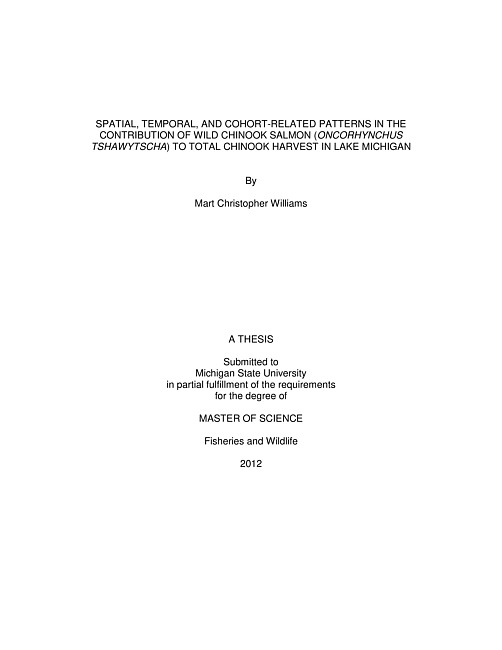 ABSTRACTSPATIAL, TEMPORAL, AND COHORT-RELATED PATTERNS IN THE CONTRIBUTION OF WILD CHINOOK SALMON (ONCORHYNCHUS TSHAWYTSCHA) TO TOTAL CHINOOK HARVEST IN LAKE MICHIGANByMart Christopher WilliamsDuring 2006-2010, the majority of hatchery-produced Chinook salmon (Oncorhynchus tshawytscha) stocked into Lake Michigan were marked with a combination of oxytetracycline (OTC), coded-wire-tags (CWT), and fin-clips to distinguish between hatchery and wild origin. The goals of this research were to: (1) evaluate the accuracy and reproducibility of the OTC mark, (2) examine spatial, temporal, and cohort-related patterns in the contribution of wild Chinook salmon, and (3) explore how differences in size-at-age and maturity-at-age may affect the proportion of wild Chinook salmon. OTC mark accuracy and reproducibility was determined to be adequate based on the error matrix fish, OTC mark quality distribution, and OTC mark presence/absence reader agreement was excellent. The lakewide proportion of wild age-1 Chinook salmon for four year-classes ranged from 53.52 to 56.92% with little interannual variation. The proportion of wild Chinook salmon increased as the fish became older (i.e., age-effect), suggesting differential survival between hatchery and wild fish. The proportion of wild age-1 Chinook salmon was greater in Michigan than Wisconsin, but was similar for older ages. The proportions of wild Chinook salmon for northern and southern Lake Michigan were similar for all four age-classes. The proportion of wild Chinook salmon in the northeast, northwest, and southwest regions all had an age-effect, however, the southeast region did not have an age-effect. The southeast region had the highest proportion of wild age-1 Chinook salmon.