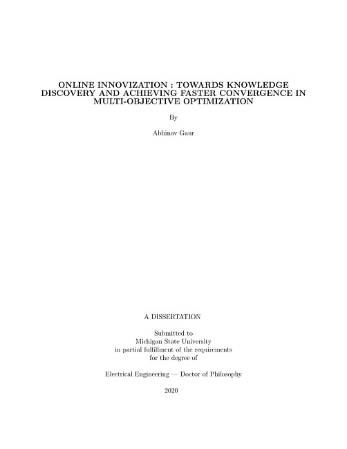 Ì0300nnovization'' is a task of learning common principles thatexist among some or all of the Pareto-optimal solutions in amulti-objective optimization problem. Except a few earlierstudies, most innovization related studies were performed onthe final non-dominated solutions found by an evolutionary multi-objective algorithm eithermanually or by using a machine learning method.Recent studies have shown that these principles can be learnedduring intermediate iterations of an optimization run and simultaneously utilized in thesame optimization run to repair variables to achieve a fasterconvergence to the Pareto-optimal set. This is what we are calling as ò0300nline innovization'' as it is performed online during the run of an evolutionary multi-objective optimization algorithm. Special attention is paid to learning rules that are easier to interpret, such as short algebraic expressions, instead of complex decision trees or kernel based black box rules.We begin by showing how to learn fixed form rules that are encountered frequently in multi-objective optimization problems. We also show how can we learn free form rules, that are linear combination of non-linear terms, using a custom genetic programming algorithm. We show how can we use the concept of k0300nee' in PO set of solutions along with a custom dimensional penalty calculator to discard rules that may be overly complex, or inaccurate or just dimensionally incorrect. The results of rules learned using this custom genetic programming algorithm show that it is beneficial to let evolution learn the structure of rules while the constituent weights should be learned using some classical learning algorithm such as linear regression or linear support vector machines. When the rules are implicit functions of the problem variables, we use a computationally inexpensive way of repairing the variables by turning the problem of repairing the variable into a single variable golden section search.We show the proof of concept on test problems by learning fixed form rules among variables of the problem, which we then use during the same optimization run to repair variables. Different principleslearned during an optimization run can involve differentnumber of variables and/or variables that arecommon among a number of principles. Moreover, a preferenceorder for repairing variables may play an important role forproper convergence. Thus, when multiple principles exist, itis important to use a strategy that is most beneficial forrepairing evolving population of solutions.The above methods are applied to a mix of test problems and engineering design problems. The results are encouraging and strongly supportsthe use of innovization task in enhancing the convergence of an evolutionary multi-objective optimization algorithms. Moreover, the custom genetic program developed in this work can be a useful machine learning tool for practitioners to learn human interpretable rules in the form of algebraic expressions.
