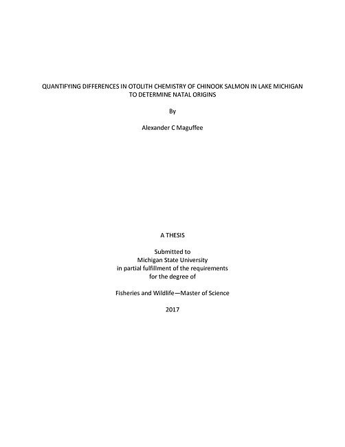 Previous research has indicated that a substantial amount of hatchery-reared Chinook salmon (Oncorhynchus tshawytscha) migrate from Lake Huron to Lake Michigan, likely due to greater foraging opportunities in Lake Michigan, indicating the potential for wild Chinook salmon to exhibit similar movement patterns. Thus, an increased priority has been placed on quantifying the movement of wild Chinook salmon from Lake Huron to Lake Michigan. The goal of this research was to determine the feasibility of quantifying inter-basin movement of wild Chinook salmon using otolith microchemistry techniques. Chinook salmon otolith pairs were extracted from juvenile and adult fish collected in 2015 and 2016 from tributaries in six predefined regions. Otoliths were analyzed using Laser Ablation Inductively Coupled Plasma Mass Spectrometry (LA ICP MS) to determine trace metal concentrations, and various multivariate classification algorithms were evaluated for accuracy of classification. Juvenile data reclassified to their natal regions with classification success at a basin level comparable to previous Great Lakes otolith studies. Applying the juvenile-fit models to the adult data resulted in moderate success at a basin level. MANOVAs indicated significant differences in otolith microchemistry between juvenile year classes, and these differences negatively affected classification accuracy. These findings suggest that otolith microchemistry can be used to estimate wild Chinook salmon inter-basin movement, and that classification accuracy will be much higher if the model is developed from the same year class as the assessment sample.
