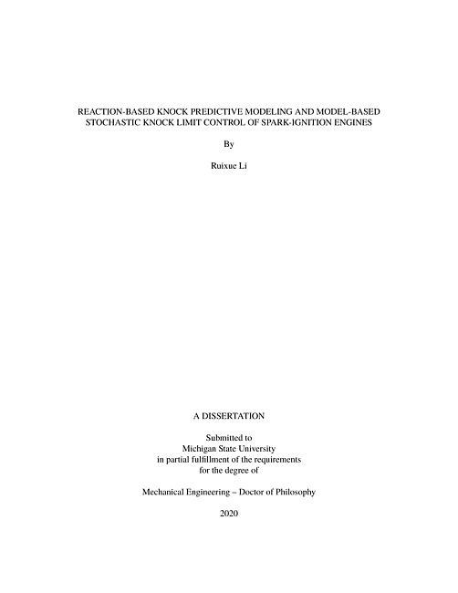 This dissertation studies the spark-ignition (SI) engine knock phenomenon, abnormal combustion due to the auto-ignition of end-gas ahead of the propagated flame front, resulting in the rapid chemical energy release with aggressive combustion, limiting the further improvement of thermal efficiency and even damaging the engine mechanically. A control-oriented combustion and pressure wave model with satisfactory accuracy and low computational effort is a necessity for the knock control strategy design. This dissertation develops a control-oriented knock predictive model that includes a two-zone reaction-based combustion model and a pressure wave model. This knock predictive model is capable of accurately describing the combustion process of a spark-ignited engine and predict the in-cylinder pressure oscillations under knocking combustion in real-time. Based on this model, a feedforward and feedback stochastic knock limit control strategy is developed to reduce the knock cyclic variability and control the knock mean-intensity below a desired up bound while keeping spark timing as close to engine maximum brake torque (MBT) timing as possible. A control-oriented two-zone reaction-based model to accurately describe the combustion process of a SI engine is first developed. Instead of using the conventional pre-determined Wiebe-based combustion model, a two-step chemical reaction model is utilized to predict the combustion process along with important thermodynamic parameters such as the mass-fraction-burned, in-cylinder pressure, temperatures and individual species mass changes in both zones. Sensitivities of model parameters are analyzed during the model calibration process. As a result, one set of calibration parameters are used to predict combustion characteristics over all engine operating conditions studied in this paper, which is the major advantage of the proposed method. Also, the proposed modeling approach is capable of modeling the combustion process for real-time simulations. As the by-product of the model, engine knock can also be predicted based on the Arrhenius integral in the unburned zone, which is valuable for model-based knock control. The proposed combustion model is intensively validated using the experimental data with a peak relative prediction error of 6.2% for the in-cylinder pressure. Based on this validated combustion model, a control-oriented pressure wave model for SI engines is further developed. This model is capable of predicting the in-cylinder pressure oscillations under knocking combustion in real-time and can be used for the model-based knock prediction and control. A pressure wave equation including the knock deadening behavior is proposed, simplified, and used to calculate the pressure perturbations generated by the knocking combustion. The boundary and initial conditions at knock onset are analyzed and the analytic solution of the pressure wave equation is obtained. The model is calibrated and validated over two different engine operating conditions at knock limit. The chemical kinetic-based Arrhenius integral (ARI) and the KI20 are used as the evaluation methods for knock onset and intensity prediction, and the knock frequency is studied with a fast Fourier transform of the filtered in-cylinder pressure oscillations. Especially, the knock characteristics associated with gas mixture properties at intake valve closing is analyzed based on the experimental data and their effect to knock cycle-to-cycle variation is also studied for the proposed model. In addition, this dissertation studies the correlation between in-cylinder mixture temperature at intake valve closing and the engine knock, along with knock cyclic variability based on the knock predictive model. A strong correlation between the intake temperature and knock intensity has been obtained and validated based on the simulation investigation and experiment data obtained at knock limit. Therefore, a model-based feedforward and feedback stochastic knock limit control strategy is developed to reduce the knock cycle-to-cycle variability and maintain the knock mean-intensity within a desired up bound by controlling the spark timing as close to MBT timing as possible. The control performance is validated with the simulation results to show the capability of the model-based feedforward and feedback stochastic knock limit control in significantly reducing the knock cyclic variability and improving the knock intensity distribution for the best fuel economy.