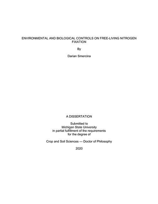 Free-living nitrogen fixation (FLNF) is the biological conversion of gaseous N2 into ammonia (NH3) by heterotrophic bacteria and archaea not in symbiosis with plants. This energy intensive process occurs predominately where carbon (C) is readily available to support these high energy demands, such as in the rhizosphere where roots exude C into the soil environment. FLNF has continually gained attention as an important and ubiquitous N source to terrestrial systems and as a potential alternative to fertilizer N addition in crop production. In particular, it has gained interest for its potential to support production of bioenergy cropping systems, like switchgrass (Panicum virgatum), particularly when grown on marginal lands. Diverse communities of N-fixing organisms (diazotrophs) have been identified in the rhizospheres of these cropping systems as well as FLNF activity. But, to harness this potential N source it is important to understand the controls on FLNF. My dissertation work characterizes biological and environmental controls on FLNF associated with the switchgrass rhizosphere.Though there are decades of research available on symbiotic N-fixation, the conditions under which FLNF occurs are quite distinct including dynamic C sources and availabilities, oxygen concentrations, and N availability. FLNF is also carried out by a diverse community of diazotrophs rather than a single population as with symbiotic N-fixation. To determine the important controls on FLNF, I first tested impacts of C source and oxygen concentration on FLNF through development of an optimized method for measuring FLNF. I found that increased diversity of C sources and lower oxygen concentrations promoted the most FLNF. I then examined the effects of legacy and short-term N additions on both FLNF rates and the composition of the diazotroph community in the switchgrass rhizosphere. Surprisingly, I found no evidence for legacy or short-term N controls on FLNF rates or diazotroph community composition. However, I found a strong rhizosphere effect on diazotroph community composition, suggesting switchgrass selects for a distinct and consistent N-fixing community. Lastly, I determined controls on FLNF under field conditions and how these controls relate to plant available N, using a variety of field and molecular data. I found that soil N availability was the dominant control on FLNF, but the direction of this control depended on the soil N pool. Together, my work highlights several important environmental and biological controls on FLNF and ultimately improves our ability to understand and predict this important N source for terrestrial systems. Lastly, my work adds to the growing body of evidence that FLNF occurs in many systems and can contribute largely to plant N demands. By extrapolating the average of my measured FLNF rates from μg N fixed g-1 dry soil day-1 to kg N ha-1 yr -1, I found FLNF has the potential to contribute upwards of 11.0 kg N ha-1 yr -1. These rates are 2x greater than the estimated contribution of N from symbiotic N-fixation in temperate grasslands and meet approximately 31% of the N deficit identified in switchgrass systems from previous work. Although these extrapolated rates are based on optimized conditions for potential FLNF rates and therefore are likely overestimates, they highlight the important role of FLNF in switchgrass cropping systems and its potential to contribute to improving the sustainability of bioenergy production.