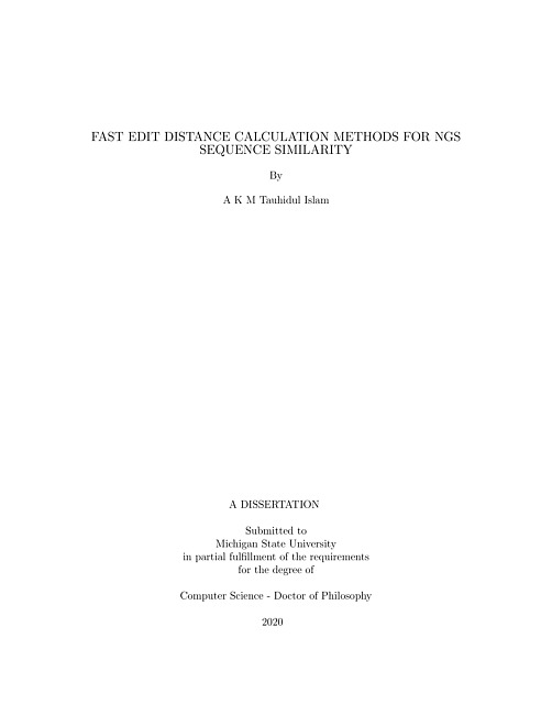 Sequence fragments generated from targeted regions of phylogenetic marker genes provide valuable insight in identifying and classifying organisms and inferring taxonomic hierarchies. In recent years, significant development in targeted gene fragment sequencing through Next Generation Sequencing (NGS) technologies has increased the necessity of efficient sequence similarity computation methods for very large numbers of pairs of NGS sequences.The edit distance has been widely used to determine the dissimilarity between pairs of strings. All the known methods for the edit distance calculation run in near quadratic time with respect to string lengths, and it may take days or weeks to compute distances between such large numbers of pairs of NGS sequences. To solve the performance bottleneck problem, faster edit distance approximation and bounded edit distance calculation methods have been proposed. Despite these efforts, the existing edit distance calculation methods are not fast enough when computing larger numbers of pairs of NGS sequences. In order to further reduce the computation time, many NGS sequence similarity methods have been proposed using matching k-mers. These methods extract all possible k-mers from NGS sequences and compare similarity between pairs of sequences based on the shared k-mers. However, these methods reduce the computation time at the cost accuracy.In this dissertation, our goal is to compute NGS sequence similarity using edit distance based methods while reducing the computation time. We propose a few edit distance prediction methods using dataset independent reference sequences that are distant from each other. These reference sequences convert sequences in datasets into feature vectors by computing edit distances between the sequence and each of the reference sequences. Given sequences A, B and a reference sequence r, the edit distance, ed(A.B) 2265 (ed(A, r) 0303ed(B, r)). Since each reference sequence is significantly different from each other, with sufficiently large number of reference sequences and high similarity threshold, the differences of edit distances of A and B with respect to the reference sequences are close to the ed(A,B). Using this property, we predict edit distances in the vector space based on the Euclidean distances and the Chebyshev distances. Further, we develop a small set of deterministically generated reference sequences with maximum distance between each of them to predict higher edit distances more efficiently. This method predicts edit distances between corresponding sub-sequences separately and then merges the partial distances to predict the edit distances between the entire sequences. The computation complexity of this method is linear with respect to sequence length. The proposed edit distance prediction methods are significantly fast while achieving very good accuracy for high similarity thresholds. We have also shown the effectiveness of these methods on agglomerative hierarchical clustering.We also propose an efficient bounded exact edit distance calculation method using the trace [1]. For a given edit distance threshold d, only letters up to d positions apart can be part of an edit operation. Hence, we generate pairs of sub-sequences up to length difference d so that no edit operation is spilled over to the adjacent pairs of sub-sequences. Then we compute the trace cost in such a way that the number of matching letters between the sub-sequences are maximized. This technique does not guarantee locally optimal edit distance, however, it guarantees globally optimal edit distance between the entire sequences for distance up to d. The bounded exact edit distance calculation method is an order of magnitude faster than that of the dynamic programming edit distance calculation method.