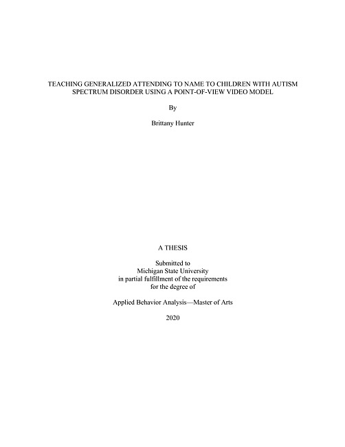 Social and communicative deficits are one of the hallmark traits of autism spectrum disorder (ASD). One of the deficits associated with ASD is attending to a social partner in response to name. Responding to name is important for safety and social reasons. Though responding to name is seen as incredibly important and is often one of the first skills targeted in a child's program, current strategies focus on teaching this response at an instructional table and do not promote generalization to a more natural environment. Video modeling has been demonstrated to be an efficient and least intrusive method of prompting for children with ASD because it limits the number of stimuli in the environment. Point-of-view video modeling further limits the number or stimuli and may prove to be effective in teaching the discrete skill of attending to an adult in response to name. A multiple probe design was utilized to determine the efficacy of using a point-of-view video modeling to teach three young children with ASD to respond to their name. Due to the COVID-19, the current study was terminated before the experiment could be completed. Of the collected data, there is some evidence to support the use of point-of-view video models as a method for teaching attending in response to name to children with ASD.