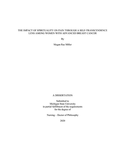 With up to 83% of women with advanced breast cancer reporting pain (Puetzler, Feldmann, Brascher, Gerhardt, & Benrath, 2014), management of this symptom continues to be a critical problem. Spirituality (a dynamic process by which humans experience connection with self, others, nature and/or higher power and a sense of meaning) is one area that has not yet been adequately investigated, as it may positively impact the experience of pain in this population. The purpose of this dissertation was to examine the impact of spirituality on pain in women with advanced breast cancer within the context of a Complementary and Integrative Health (CIH) intervention, using the Theory of Self-Transcendence (ST) as a guide. This dissertation is comprised of three manuscripts: 1) Literature review; 2) Report of a quantitative secondary data analysis; 3) Report of a qualitative study. Each address the central topic; the impact of spirituality on pain.Manuscript 1 is a scoping literature review characterizing how pain and spirituality have been conceptualized, assessed, and addressed among women with advanced breast cancer. Forty-two publications were included. Most focused on pain (n = 33), while others addressed pain and spirituality (n=5), and exclusively spirituality (n=4). Women cited dimensions of spirituality as important for coping with their disease, suggesting the value of spirituality to cope with pain. A gap in understanding spirituality and its influence on pain in this population was identified.Manuscript 2 is a secondary analysis based on a National Cancer Institute-funded randomized controlled trial of foot reflexology for women with advanced breast cancer (n=256) (Wyatt, Sikorskii, Holmstrom, & Luo, 2011-2016). This manuscript examined demographic and clinical factors associated with pain and spirituality, the impact of spirituality on pain, and how spirituality and pain impacted engagement with the CIH intervention. Results revealed that various demographic and clinical factors were associated with pain and/or spirituality. The impact of spirituality on pain was not significant over time. Spirituality and pain were not associated with engaging in reflexology sessions.Manuscript 3 describes a phenomenological qualitative study examining pain and spirituality in women with advanced breast cancer, as well as perceived relationships between these concepts. N=9 semi-structured interviews were conducted. Data were analyzed using an open-coding process. Themes included: 1) Spirituality provides positive cognitive framing to help women face pain; 2) Spirituality brings about positive emotions such as peace and tranquility despite pain; 3) Spiritual practices serve as pain self-management tools; 4) Connection with others and service activities (aspects of spirituality) help women cope with pain.The findings from these three manuscripts advance nursing science by providing new insight into the nature of pain and spirituality. The Theory of ST was supported, and potentially extended, through findings from each of the three manuscripts. This work impacts nursing by providing novel insights into the nature of pain and spirituality in women with advanced breast cancer, and how spirituality may impact perceptions associated with how pain is experienced. This dissertation is the first step in a program of research to develop CIH-based, nurse-led pain management interventions for patients with cancer, which may include spirituality.
