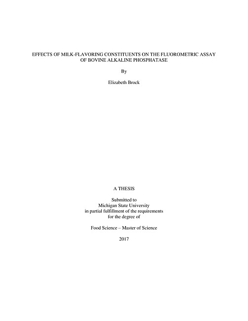 "Determining the activity of residual alkaline phosphatase (ALP, EC 3.1.3.1) in milk validates adequate pasteurization and confirms that cross-contamination of raw milk has not occurred, thus ensuring product safety. However, flavored milks have been shown to yield false positive or false negative ALP activities, which inaccurately represent the microbiological safety of the milk sample. The objectives of this study were to determine the effects of 1) homogenization, 2) pasteurization conditions, and 3) ingredient inclusion on residual ALP activity using the fluorometric assay for analyses. Preliminary work determined no significant differences (P > 0.05) in ALP activity as a function of dual-stage homogenization (1,500 and 500 psi) or differing pasteurization methods including high temperature, short time (HTST, 72oC for 15 s) and low temperature, long time (LTLT, 63oC for 30 min). Pure vanilla extract, cocoa powder, or sucrose was added to standardized 3.25% fat raw milk at 0.1, 1.5, and 8%, respectively. A control (no ingredients) was included as the fourth group. All four treatments were pasteurized at HTST conditions. ALP activity did not significantly differ among treatment groups (P > 0.05) and was adequately inactivated (< 350 mU/L). However, the treatment containing cocoa powder had the highest ALP activity at 106.70 mU/L in comparison to the control at 19.32 mU/L, suggesting the primary polyphenols of the ingredient are inducing a conformational change of the enzyme or interacting with the quantified fluorescence produced. With flavored milk sales rising in recent years, ensuring product safety and understanding potential interactions are imperative in the dairy industry."--Page ii.