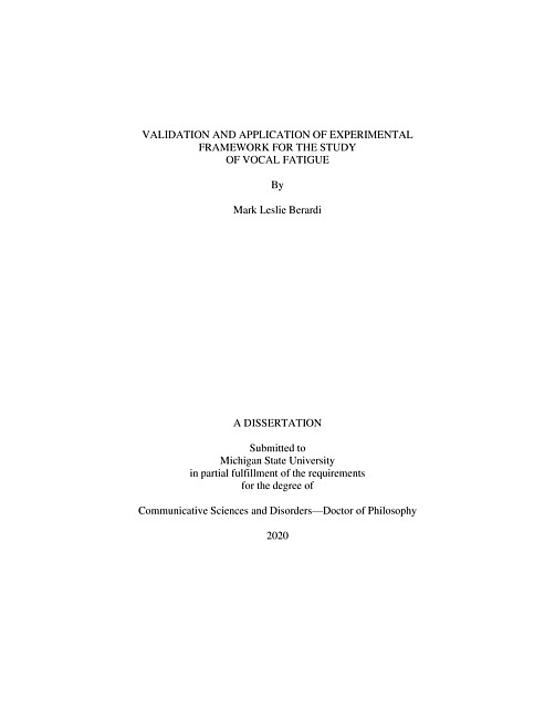 In recent years, vocal fatigue research has been increasingly studied particularly with application to the reduction of its impact on schoolteachers and other occupational voice users. However, the concept of vocal fatigue is complex and neither well defined or well understood. Vocal fatigue seems to be highly individualized and dependent on several underlying factors or concepts. The purpose of this dissertation is to propose and support through experimentation a framework that can identify the factors contributing to vocal fatigue. The main hypothesis is that the change in vocal effort, vocal performance, and/or their interaction through a vocal demand (load) will implicate vocal fatigue. To test this hypothesis, three primary research questions and experiments were developed. For all three experiments vocal effort was rated using the Borg CR-100 scale and vocal performance was evaluated with five speech acoustic parameters (fundamental frequency mean and standard deviation, speech level mean and standard deviation, and smoothed cepstral peak prominence).The first research question tests whether perceived vocal effort can be measured reliably and if so, how vocal performance in terms of vocal intensity changes with a vocal effort goal. Participants performed various speech tasks at cued effort levels from the Borg CR-100 scale. Speech acoustic parameters were calculated and compared across the specific vocal effort levels. Additionally, the test-retest reliability across the effort levels for speech level was measured. Building from that experiment, the second research question was to what degree are vocal performance and vocal effort related given talker exposure to three equivalent vocal load levels. This experiment had participants performing speech tasks when presented with three different equivalent vocal load scenarios (communication distance, loudness goal, and background noise); for a given load scenario, participants rated their vocal effort associated with these tasks. Vocal effort ratings and measures of vocal performance were compared across the vocal load levels. The last research question built on the previous two and asked to what degree do vocal performance, vocal effort, and/or their interaction change given a vocal load of excess background noise (noise load) over a prolonged speaking task (temporal load). To test this, participants described routes on maps for thirty minutes in the presence of loud (75 dBA) background noise. Vocal effort ratings and measures of vocal performance were compared throughout the vocal loading task.The results indicate that elicited vocal effort levels from the BORG CR-100 scale are distinct in vocal performance and reliable across the participants. Additionally, a relationship between changes in vocal effort and vocal performance across the various vocal load levels was quantified. Finally, these findings support the individual nature of the complex relationship between vocal fatigue, vocal effort, and vocal performance due to vocal loads (via cluster and subgroup analysis); the theoretical framework captures this complexity and provides insights into these relationships. Future vocal fatigue research should benefit from using the framework as an underlying model of these relationships.