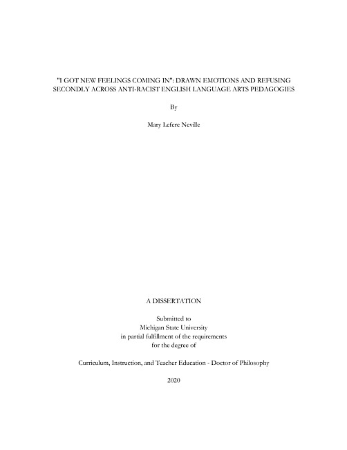 Given the current and historical context of power and oppression in the United States, English language arts (ELA) scholars have called for pedagogies that directly respond to the racialized violence present across texts, schooling, and society (Baker-Bell, Butler, & Johnson, 2017; Baker-Bell, 2020; Butler, 2018; Johnson, 2018). Scholars have long critiqued the ELA curriculum for its dearth of perspectives across race, class, gender, sexuality, and ability, and especially have called upon ELA teachers and researchers to center literature written by Black and Brown authors (Thomas, 2016, 2019). In this call for anti-racist ELA curriculum, scholars have also encouraged an attention to emotion, highlighting the necessity of not only including texts by authors of Color in classrooms but also the importance of the emotional and affective resonances through which students and teachers respond to literary texts for racial and social justice (Dutro, 2019; Grinage, 2019). This qualitative research project, then, explores the emotional responses of secondary ELA students and pre-service literacy teachers to literature that addresses race and racism. This dissertation builds upon critical (post)qualitative and visual arts-based methodologies centering the emotional and affective resonances present across our socially constructed identities as students and teachers work to deconstruct whiteness and anti-Blackness using anti-racist pedagogies (Sousanis, 2015; Love, 2019; Muhammad, 2019). In particular, this project explores how objects of feeling are drawn across space and time (Ahmed, 2010, 2014) and how readers refuse "secondly" (Adichie, 2009) within two research contexts: (1) a 12th critical media literacy course and (2) a critical young adult literature course for pre-service teachers. Findings from this study demonstrate how secondary ELA students and pre-service teachers might center the already present emotion traced across objects of feeling in literature classrooms committed to anti-racist and anti-oppressive pedagogies.