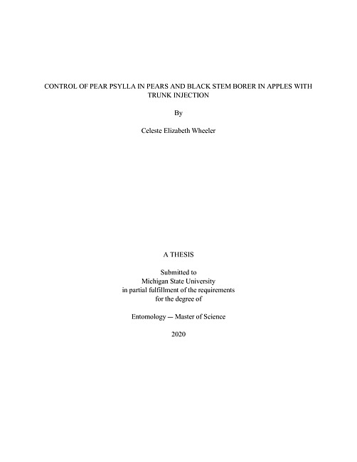 The use of pesticides to produce fruit crops is essential to the economic success of farmers. Consumers have a high standard for acceptable fruit, and pesticides are key to the farmer's ability to produce marketable fruit. In the past 50 years, there has been a shift towards using safer active ingredients to protect both humans and the environment. The government continues to ban unsafe, broad-use pesticides, and label new chemistries with more specific active ingredient targets. If this trend towards more responsible pesticide usage continues, there will be a need for more direct targeting of the pesticides on the crops. The most common method of pesticide application is airblast spraying. This method has huge drawbacks. It has been shown that with airblast application, less than 0.1% of pesticides applied to crops reaches its target pest. Most of the pesticide is lost to drift, leaching, and degradation by the sun, and risks exposure to non-target populations. Trunk injection should be considered as an alternative delivery method for pesticides. It delivers the pesticide directly into the tree's system without losing pesticide to drift and is contained within the tree. Trunk injection has been effectively used to control foliar pests in apple trees and wood boring pests such as the emerald ash borer. One injection can provide multiple seasons of control. In the current two studies, we use trunk injection to apply insecticides and evaluate their efficacy at controlling two very different orchard pests, the pear psylla in pear and the black stem borer in apple. The objective of the first study is to compare the efficacy of abamectin and azadirachtin in the control of pear psylla in pear using two different application methods, airblast and trunk injection. Trunk injections of abamectin and azadirachtin were compared to airblast applications of equal labeled rates on 33-year-old Bartlett Pear trees (Pyrus communis L., var "Bartlett"). The abamectin and azadirachtin trunk injected treatments controlled pear psylla as well or better than the airblast applied treatments. Trunk injecting from the first season provided a moderate level of control into the second season, one year after the injections. The objective of the second study is to evaluate the efficacy of two insecticides, emamectin benzoate and azadirachtin, and injection timing fall and spring, on their ability to control BSB in apple trees with simulated topworking and ethanol injection as an attractant.