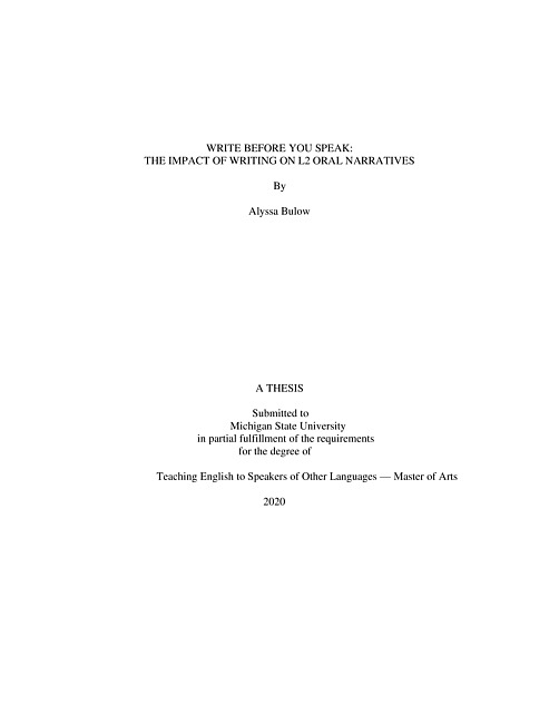 Current literature suggests that writing may better facilitate language learning than speaking practice alone, but direct empirical research demonstrating this is limited. Evidence is also limited as to whether grammar and vocabulary learned while writing can transfer to speaking. This study investigates the prediction that written planning, even more so than oral planning, leads to improved oral narratives. Thirty-four Spanish-speaking learners of English were randomly assigned to one of two groups: writing rehearsal or oral rehearsal; rehearsal being individual practice before the final task. The writing group composed a story ending in the written modality while the oral group rehearsed by narrating theirs out loud. Both groups recorded their oral story continuation task as the final product. In order to compare the impact of writing versus oral rehearsal on learners' subsequent oral performance, final narratives were examined using complexity, accuracy, and fluency measures. Results showed that the writing group produced more fluent and lexically diverse narratives than the speaking group but there was no effect on accuracy, and limited effects on grammatical complexity. The study concludes with pedagogical implications for using writing tasks to prepare students for oral tasks.Keywords: L2 writing, complexity, fluency, story continuation task (SCT), EFL, benefits of writing for speaking, pre-task planning, rehearsal.