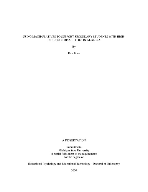 All students, including students with disabilities, are expected to learn mathematics at high levels. As algebra is considered to be the gatekeeper to higher level mathematics and beyond, it is essential for teachers to use effective practices, including the use of manipulatives, to support student learning. This alternative dissertation is comprised of three studies that explored teaching algebra to secondary students with high-incidence disabilities. The first was an evidence-based systematic review of literature investigating instructional practices to teach algebra to secondary students with high-incidence disabilities. Twenty studies published from 1999-2019 were reviewed and analyzed, of which 14 met the standards of high quality set by the Council for Exceptional Children (CEC), and five practices earned the label of potentially evidence-based (i.e., concrete-representational-abstract framework, manipulatives, enhanced anchor instruction, schema based instruction, and peer-assisted learning strategies). The second study used an alternating treatment design to compare the effectiveness of concrete algebra tiles to virtual algebra tiles to support middle school students with disabilities as they solved linear equations. Students were successful solving linear equations regardless of the type of manipulative they used, but preferred using the virtual tool. The final study used a multiple probe across behaviors, replicated across participant design to examine the effectiveness of the VA framework to support secondary students with high-incidence disabilities in their acquisition of algebra skills. A functional relationship existed between the VA framework and student performance on algebra probes, and students scored better on maintenance probes compared to baseline data. While there remains a need for more high-quality research examining effective practices in supporting secondary students with high-incidence disabilities in the area of algebra, the studies in this alternative dissertation suggest manipulatives, both as a stand-alone tool and as part of a process is an effective, and efficient intervention.