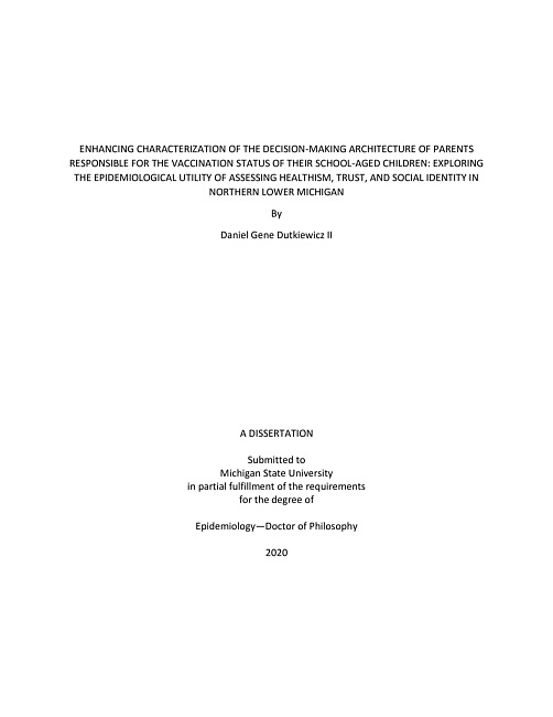 Enhancing characterization of the decision-making architecture of parents responsible for the vaccination status of their school-aged children : exploring the epidemiological utility of assessing healthism, trust, and social identity in northern lower ...