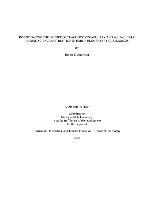 Oral language and vocabulary development in the early-elementary grades is important for students' overall academic success. Oral language and vocabulary support science learning, and reciprocally, the background knowledge and vocabulary students gain when learning about the natural world supports their reading comprehension. Therefore, oral language and vocabulary development should be an essential focus of instruction for early-elementary students, and as such, current national standards for literacy and science instruction each emphasize oral language development. Given the importance of oral language and vocabulary development for both literacy and science learning, it is critical to understand how teachers support this development in early-elementary science instruction. Most observational studies of vocabulary instruction have taken place within the context of literacy instruction. As little is known about how teachers promote oral language and vocabulary development in science instruction in the early-elementary grades, the present study investigated (1) how teachers use language to promote oral language and vocabulary development during science instruction in the early-elementary grades, (2) whether/how vocabulary talk relates to the language aspects of science talk, and (3) what features of science curriculum materials are related to enhanced vocabulary talk.To answer these questions, I conducted two instrumental case studies. In the first study, I examined the science instruction of a cohort of eight early-elementary teachers in order to understand how they used language to promote students' oral language and vocabulary development. In the second study, I examined the science instruction of Ms. Thompson, kindergarten teacher, in order to identify features of science curriculum materials that are related to enhanced vocabulary talk during science instruction. In total, 24 video recorded science lessons provided 894.27 minutes of observational data across three timepoints from the eight participating teachers. I used discourse analysis and other qualitative analysis techniques to examine the vocabulary talk moves (i.e., ways of using language to promote oral language and vocabulary development) the teachers made during science instruction. I also used quantitative techniques to make within- and between-teacher comparisons of vocabulary talk over the course of the study.The cohort of teachers used considerably more vocabulary talk moves for building students' knowledge of word meanings than for scaffolding students' word use, building students' awareness of words and word learning, or interesting students in words and word learning. This study points to the need to consider the context in which vocabulary talk moves are made and the overall quality of this vocabulary talk in addition to examining which moves the teachers make. Curriculum materials that (a) identified target words and provided child-friendly explanations/definitions, (b) used texts that highlight these target words and provided supports for extra-textual talk promoting vocabulary talk, and (c) offered discussion prompts that deepen students' understandings of target word meanings were associated with enhanced vocabulary talk by Ms. Thompson. Likewise, the absence of these curricular features was associated with less vocabulary talk.This study contributes to the field's understanding of the ways that science instruction supports literacy learning and literacy instruction supports science learning in the early-elementary grades. The findings from this study have implications for curriculum development, teacher professional development, teacher preparation, and policy.