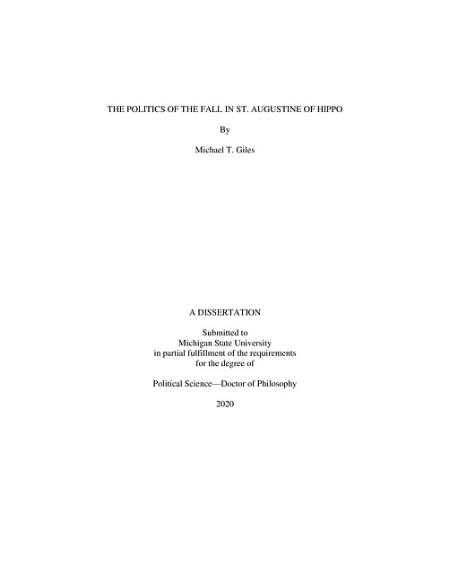 This dissertation examines the thought of St. Augustine of Hippo, arguing for the importance of "the fall" of mankind for contemporary political life. Augustine believes that human nature was shaped by a cataclysmic fall from grace. His influential interpretation of the Biblical story is well-known, and yet the political features of this account have not been subjected to a systematic study. This work aims to remedy this shortcoming by wrestling with Augustine's presentation of the fall across a wide variety of political concerns. The dissertation proceeds in four substantive chapters, each of which deals with a different sphere of human endeavor or hope. Chapter one considers Augustine's account of work before and after the fall, and compares his view with the more contemporary and secular ideas of Karl Marx. The second chapter analyzes the effect of the fall on human sociality. It makes the case that Augustine sees a duality in mankind's originally social nature. In the third chapter, I contend that Augustine sees the basic political problems of desire and mortality as dominating the life of mankind as a fallen creature. It is the fall that transforms these things into problems for us. Finally, the fourth chapter gives an original account of Augustine's treatment of glory-seeking. From all these chapters a surprising conclusion can be drawn: the idea of human corruption, far from simply denouncing humanity as depraved, articulates a much more nuanced, balanced, and ultimately realistic account of political life.