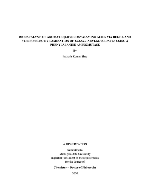 Biocatalytic process-development continues to advance toward discovering alternative transformation reactions to synthesize medicinally important molecules such as, β-hydroxy-α-amino acids. These bifunctional building blocks, a subclass of noncanonical amino acids, have two stereocenters and are valuable in the natural product, pharmaceutical, and agrochemical sectors.Here, a 5-methylidene-3,5-dihydro-4H-imidazol-4-one (MIO)-dependent phenylalanine aminomutase from Taxus canadensis (TcPAM) was repurposed to irreversibly biocatalyze an intermolecular amino group transfer regioselectively from (2S)-styryl-α-alanine to ring-substituted racemic trans-3-arylglycidates (i.e., cinnamate epoxides) to make the corresponding arylserines. The reaction scope of MIO-aminomutases, which primarily catalyze the reversible interconversion of α- and β-amino acids, can also catalyze the hydroamination of arylacrylates to form α- and β-amino acids. Here, we explore glycidates as a new class of substrates for the MIO-aminomutase family of enzymes. Racemic trans-3-arylglycidates were regio- and stereoselectively aminated to produce a mixture of anti-arylserine enantiomers predominantly. 3-Arylglycidates usually prefer nucleophilic attack at the benzylic Cβ due to stabilization of the partial cationic properties (δ+) at the Cβ by the aryl ring, a stabilization that does not occur at Cα. TcPAM catalysis, however, inverted this inherent nucleophilic regioselectivity by aminating at the Cα of trans-3-arylglycidates to make arylserine predominantly (97%) over arylisoserine (3%). From among twelve substrates, the aminomutase ring-opened 3'-Cl-phenylglycidate to 3'-Cl-phenylserine 140 times faster than it opened the 4'-Cl-isomer, which was turned over slowest among all epoxides tested. GC/MS analysis of chiral auxiliary derivatives of the biocatalyzed arylserine analogues showed that each product mixture contained (2S)+(2R)-anti and (2S)+(2R)-syn pairs with the anti-isomers predominating (~90:10 dr). Integrating the vicinal proton signals in the 1H-NMR spectrum of the biocatalyzed arylserines and calculating the chemical shift difference (Δδ) between the anti and syn proton signals confirmed the diastereomeric ratios and relative stereochemistries. Application of a (2S)-threonine aldolase from E. coli further established the absolute stereochemistry of the chiral derivatives of the diastereomeric biocatalyzed products. The 2R:2S ratio for the biocatalyzed anti-isomers was highest (88:12) for 3'-NO2-phenylserine and lowest (66:34) for 4'-F-phenylserine. This showed that the stereospecificity of TcPAM is, in part, directed by the substituent-type on the arylglycidate analogue.We also synthesized enantiopure 3-phenylglycidates and incubated them separately with TcPAM. The absolute configurations of the biocatalyzed anti-phenylserine (major) and phenylisoserine (minor) were evaluated to gain insights on the substrate specificity and selectivity of TcPAM for aminating 3-phenylglycidate enantiomers. TcPAM converted (2S,3R)-3-phenylglycidate to (2S)-anti-phenylserine predominantly (89%) and (2R,3S)-3-phenylglycidate to (2R)-anti-phenylserine (88%) over their antipodes with inversion of configuration at Cα in each case. Both glycidate enantiomers formed a small amount (~10%) of the syn-phenylserine with retention of configuration at the Cα. TcPAM had a slight preference toward (2S,3R)-3-phenylglycidate, which was turned over (k_cat = 0.3 min-1) 1.5 times faster than the (2R,3S)-glycidate (k_cat = 0.2 min-1). The kinetics data showed that the amination of arylglycidate process follows a two-substrate ping-pong mechanism with competitive inhibition by the epoxide substrate at higher concentration.