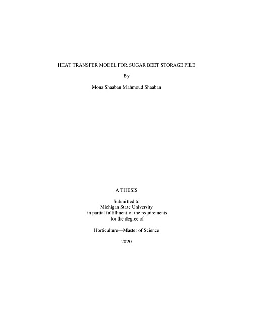 Harvested sugar beet (Beta vulgaris L.) are stored in cold regions in large piles exposed to ambient weather conditions and fluctuate temperatures during the winter storage period, which lasts for four months. To better understand the impact of air temperature on the pile temperature. A two-dimensional (2D) heat transfer steady-state model was designed to predict the temperature profile of the pile. To validate the model, temperatures obtained from the model were compared with the temperatures measured from onsite commercial piles during the storage seasons from November 2011 to January 2012 in the first season and from November 2012 to February 2013 in the second season in Reese, MI.The model tended to underestimate the pile temperature (°C). The mean difference between measured and modeled temperature values was significant (P 2264 0.05). Daily rate of sugar loss (kg/metric ton/day) based on measured and modeled temperatures were calculated and compared for model accuracy. The mean of the daily sugar loss based on the modeled pile temperature was significantly (P22640.05). Additionally, three zones (upper, middle and lower) of the pile were studied for the model accuracy. There was a significant difference between the modeled and measured the pile temperature between the three zones in the second season, whereas the first season didn't show difference between the temperatures of the upper and the middle zones (P2264 0.05). Moreover, a comparison of predicted sugar loss as a function of pile geometry was conducted under 2012 air temperature and 3°C increase in air temperature.