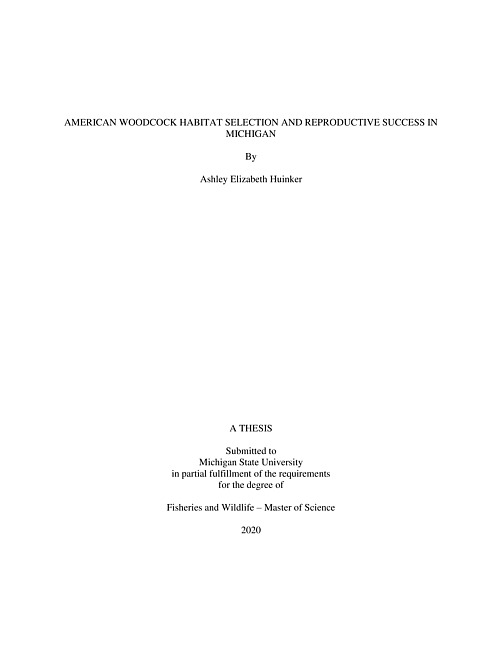 A detailed abstract with results is included at the beginning of each chapter as they are intended for separate publication. In chapter one, I evaluated how habitat selection for American woodcock (Scolopax minor) nests and broods is affected by local vegetation characteristics. I also assessed changes in earthworm density, an important food source for woodcock, over the course of the breeding season. I hypothesized that habitat selection would be different between nesting and brood-rearing hens, that selection cues would change throughout the breeding season as chicks aged, and that earthworm density would decline throughout the breeding season. I deployed cameras to woodcock nesting sites, captured and marked woodcock broods with telemetry equipment, and measured vegetation around both used and available sites. My results showed that nesting woodcock select different habitat than do brood-rearing birds and that earthworm density in the top layers of soil declines throughout the breeding season, but brood habitat selection did not change as chicks aged.In chapter 2, I linked nest success and brood survival to local habitat characteristics. I hypothesized that stem density, canopy cover, soil moisture, and soil organic matter would have positive effects on reproductive success. Using Mayfield and known fate analysis methods, I estimated nest success and brood survival from hatch to fledge. My results showed that nest success was not influenced by local habitat characteristics, but that brood survival was influenced by woody ground cover, such as shrubs and seedlings, and soil moisture. My results indicate that understory cover is an important consideration for woodcock habitat management.