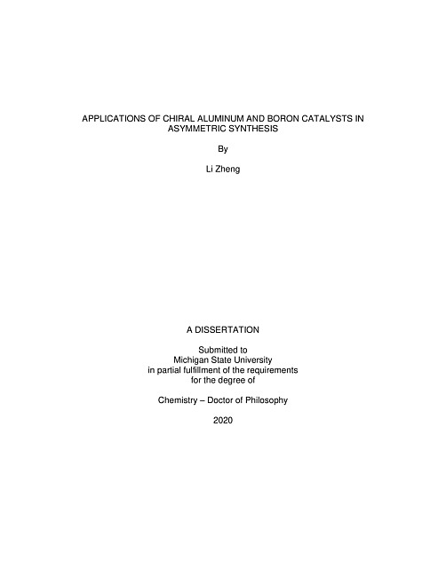 A potent chiral aluminum catalyst has been developed for asymmetric MPV reduction of ketones with broad substrate scope and excellent yields and enantiomeric inductions. The catalyst consists an aluminum core, a VANOL-derived chiral ligand and an isopropoxy group. Different ligands have been screened and reaction parameters have been optimized. A variety of aromatic (both electron-poor and electron-rich) and aliphatic ketones were converted to chiral alcohols in good yields with high enantioselectivities (26 examples, 70-98% yield and 82-99% ee). This method operates under mild conditions (-10 °C) and low catalyst loading (1-10 mol%). Furthermore, this process is catalyzed by the earth-abundant main group element aluminum and employs inexpensive and environmentally benign 2-propanol as hydride source. This catalyst has also been employed in resolution of racemic alcohols. The kinetic resolution of alcohols by Oppenauer oxidation has been achieved with moderate results. The formal dynamic kinetic resolution via Oppenauer oxidation/ MPV reduction sequence has also been examined and discussed, which avoided acylation and the use of enzymes.A highly efficient asymmetric heteroatom Diels-Alder reaction between diene and aldehydes for the construction of 6-membered heterocycles catalyzed by chiral boron catalysts has been developed. A BINOL-derived propeller borate is found to be effective catalyzing the reaction of aromatic aldehydes. A VANOL-derived meso-borate is found to be able to catalyze the reaction of both aromatic and aliphatic aldehydes with high asymmetric inductions. Excellent yields and enantioselectivities have been achieved after optimization. Furthermore, the skeleton of 6-carbon saccharides is synthesized in the reaction of 2-hydoxyacetaldehyde with different protecting groups, which can be derivatized into many saccharide analogs. The mechanism of this reaction is proposed to be concerted based on experiments involving different methods for the reaction quench. A reversal of direction of the asymmetric induction by switching boron to aluminum has been observed. Computational studies show that catalysts derived from boron and aluminum have different geometries at the Lewis acid center.
