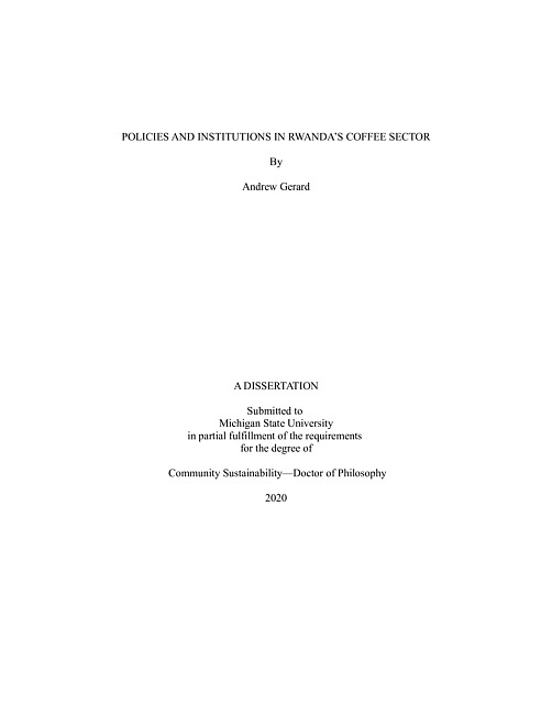 Coffee is a critical export for Rwanda and its over 350,000 coffee farming families. Despite great promise in terms of its agro-ecology and investments in quality upgrading, Rwanda has seen its production stagnate over the past two decades. In addition, coffee farmer incomes remain lower than in other East African countries. To promote the growth of the coffee sector, Rwanda's government has enacted policies aimed at increasing farmer productivity and improving the relationships between value chain actors. These approaches include centralized purchase and distribution of pesticide and fertilizer and a monopsonistic marketing policy called "zoning", which requires farmers to sell to specific coffee washing stations (CWSs), and CWSs to purchase coffee from specific farmers. Previous research found that while pesticide and fertilizer distributed improved generally since 2015, female-headed households were less likely to receive pesticide than male-headed households. It is also unclear whether zoning would improve fractious relationships between farmers and CWSs or provide CWSs with an opportunity to exploit farmers. While Rwanda's government implemented policies aimed at promoting coffee, multinational corporations have entered Rwanda's coffee sector as coffee exporters, purchasing, processing, and selling coffee onto the global market. They have consolidated exports while putting pressure on local export companies.This dissertation includes three academic papers related to policies and institutions in Rwandan coffee. The first uses semi-structured interviews with exporters and other coffee sector experts to analyze the role of export companies in Rwanda's coffee value chain. This study describes differences between local and international exporters in dealing with transaction costs, using the lens of value chain governance. The second uses a combination of a difference in differences analysis of survey data of coffee farmers and key informant interviews with CWS managers and officials to analyze the effect of Rwanda's zoning policy on services provided by CWSs to farmers. This study finds that zoning increased CWS promise and provision of second payments to farmers who were more affected by the policy. The final paper uses mental models designed based on problem tree exercises and focus groups with female household heads to better understand the challenges they face in profiting from coffee, particularly in relation to distributed inputs, and the solutions they believe could improve their production. This study finds that significant, interconnected challenges face female household heads, largely having to do with a lack of labor, lack of financing, and limited access to inputs. Participants designed numerous potential solutions, including collective action through women's associations, improved access to agricultural inputs, and more flexible financing options, among others.