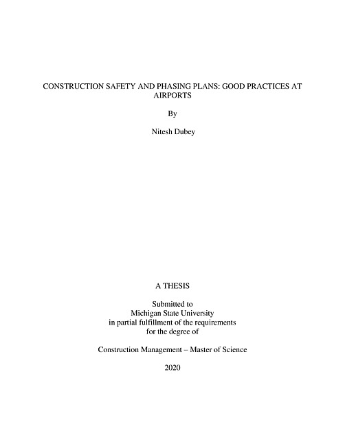 Airports are complex environments and pose a variety of safety and phasing issues. Construction operations at airports involve significant risk. An important element of the overall airport construction process is the construction safety and phasing plan (CSPP). A CSPP is defined as a document that outlines procedures, coordination, and control of safety issues during construction activity on an airport.Presently, every airport creates its own Construction Safety and Phasing Plan (CSPP) based on the most recent version of the Advisory Circular on Operational Safety of Airports during construction issued by the Federal Aviation Administration (FAA). Despite the abundance of literature on construction safety, the concept of airport construction safety is not currently widely documented, and the literature related to CSPP in the United States is still limited. Additionally, the airport industry lacks specific construction guidelines and standards in improving the development and implementation of CSPP for airport projects. Therefore, it is important to identify good practices when developing CSPP’s which could identify potential safety concerns. The goal of this research was met by using data collection methods that included an electronic survey of around 100 stakeholders. The survey data was supplemented by conducting seven semi-structured interviews as well as research validation using a case study. Descriptive qualitative analysis was used to analyze the collected data and the results are presented accordingly.