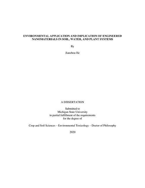 Nanotechnology is promising to develop novel engineered nanomaterials (ENMs) for industrial and consumer products, environmental engineering, and agricultural production. Specifically, ENMs can be used to remove contaminants from wastewater and to produce plant care agrochemicals (e.g., nanopesticides). The rapidly growing use of nano-enabled products is leading to increased release of ENMs into agroecosystems and their uptake by organisms and crop plants, thus posing potential threats to environmental and human health. To maximize environmental benefits and minimize potential risks of ENMs, this dissertation research focused on both environmental application and implication of ENMs in soil, water, and plant systems.The first study systematically investigated the photodegradation of antibiotic cephalexin (as an emerging contaminant in water) by novel ZnO nanowires under simulated sunlight through a combination of experimental and theoretical techniques including kinetic batch degradation, free radical trapping experiments, degradation product identification by mass spectrometry, and molecular computation. The ZnO nanowires substantially increased the degradation efficiency of cephalexin, especially under circumneutral and alkaline conditions (pH of 7.2-9.2). Anions (HCO3-) and natural organic matter inhibited the photodegradation of cephalexin by scavenging radical species (2022OH and 2022O2-). Finally, cephalexin photodegradation pathways included hydroxylation, demethylation, decarboxylation, and dealkylation. Overall, the ZnO nanowires can be potentially used for removing antibiotics from contaminated water.The second study examined the effect of biochar amendments on soil sorption of Ag NPs and Ag+, their soil-bound fractions, and their uptake and translocation by radishes grown in a loamy sand soil spiked with 1 mg kg-1 Ag NPs or Ag+. Biochar amendment had no significant effect on Ag uptake by radishes, which also did not differ with and without Ag addition. Results of Ag sorption, soil-bound fractions, and soil pore water concentrations showed that the bioavailable Ag at the environmentally-relevant concentration (1 mg/kg) was low, which may partially explain the non-significant effect of biochar amendment on the Ag uptake. This study demonstrated that the accumulation risk of Ag NPs and Ag+ ions in vegetable crops at environmentally-relevant concentrations is very low.The third study addressed the role of stomata in the internalization of Ag NPs using abscisic acid (ABA)-responsive ecotypes (Ler and Col-7) and ABA-insensitive mutants (ost1-2 and scord7) of Arabidopsis thaliana in batch sorption experiments. The sorbed amount of Ag NPs was much lower in the leaves of the Ler and Col-7 ecotypes treated with 10 M ABA than that in the ABA-free control, mainly due to ABA-induced stomatal closure. However, sorption of Ag NPs by the leaves of the ost1-2 and scord7 mutants did not change with and without ABA. Microscopic images showed that internalized Ag NPs were located in the cell membrane, cytoplasm and plasmodesmata. Clearly stomata play an important role in the internalization of ENMs in plants, which has broader implications in foliar application of nanopesticides and minimizing ENMs contamination of food crops. Overall, the sustainable use of nanotechnology will depend on improved knowledge on and proper management of its benefits and potential risks.