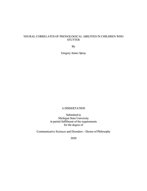 Stuttering is a complex neurodevelopmental disorder that is likely caused by an interaction of multiple factors, including genetics, linguistic ability, motor development, temperament, and neural development (Smith & Weber, 2017). Previous research has reported that children who stutter exhibit lower phonological abilities than children who do not stutter. In addition, it is commonly reported that children who stutter, as a group, exhibit decreased white matter integrity along the left dorsal language pathway (Chang, Garnett, et al., 2018; Neef et al., 2015), which is critical in supporting phonological processing and production. In this study the phonological abilities were examined in children who stutter (N = 24) and children who do not stutter (N = 31) using whole-word measures that were produced during spontaneous connected speech. These phonological scores, phonological mean length of utterance (PMLU) and proportion of whole-word proximity (PWP), provide a quantitative measure of phonological complexity and accuracy. Examining whole-word segments instead of smaller segments of speech considers the fact that children's individual words become longer and more complex as vocabulary increases (Ingram, 2002). In addition to the analysis of phonological skills, the current study examined how phonological skills are associated with white matter integrity differences in children who stutter relative to children who do not stutter.Results from this study show that children who stutter have similar phonological skills as children that do not stutter, but the association between phonological ability and white matter integrity is significantly different between the two groups. The children who stutter exhibited a greater association between PWP and white matter integrity in the bilateral dorsal language pathways than children who do not stutter. Notably, these areas were along the arcuate fasciculus, and included the right IFG (BA 45/47), right insula, and left insula/Rolandic operculum. In addition, children who do not stutter showed robust white matter integrity scores in bilateral dorsal and ventral pathways associated with age, which was not observed children who stutter. Overall, major findings from this investigation indicate that: 1) children who stutter do not differ from children who do not stutter in terms of phonological complexity as measured from spontaneous speech samples, 2) there is greater association between PWP and increased white matter integrity in bilateral dorsal tracts in children who stutter relative to children who do not stutter, 3) children who stutter exhibit an overall attenuated age-related white matter integrity growth in areas overlapping with those that showed heightened PWP-white matter integrity associations. The greater association between PWP and the bilateral dorsal tracts in children who stutter in the face of attenuated age-related increases in the same areas, suggest that stronger links between PWP and dorsal pathway integrity may be needed in children who stutter to achieve comparable phonological development to children who do not stutter. These results provide novel insights into phonological development in children who stutter, and the behavior - neural development associations relevant to phonological development that seem to differ in children who stutter.