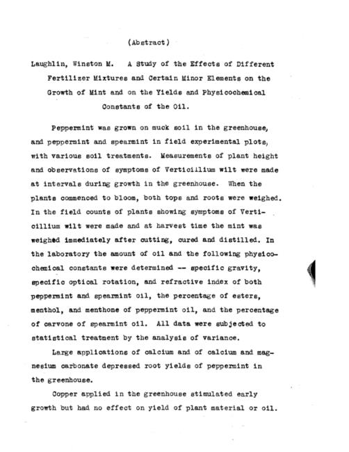 A study of the effects of different fertilizer mixtures and certain minor elements on the growth of mint and on the yields and physicochemical constants of the oil