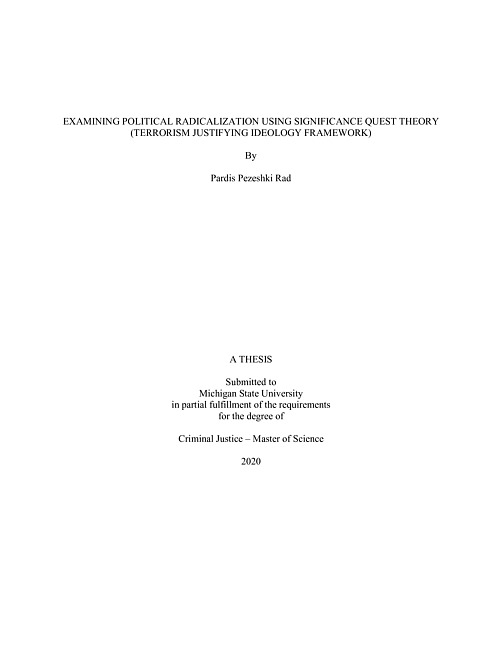 ABSTRACTEXAMINING POLITICAL RADICALIZATION USING SIGNIFICANCE QUEST THEORY (TERRORISM JUSTIFYING IDEOLOGY FRAMEWORK)ByPardis Pezeshki RadOne framework of radicalization, called Significance Quest Theory (SQT), is based on assumptions that an individual’s quest for personal significance is the lead factor in promoting political radicalization. Under the framework of Significance Quest Theory (SQT), an individual is pushed towards political radicalization through three distinct means: needs, narratives, and networks. These factors have been found to increase terrorism involvement, yet quantitative studies are meager. This thesis represents needs, narratives and networks with locus of control, modernization, reliance on religious leaders, and religiosity to examine how these are related to political radicalization among a sample of youth. Using a secondary dataset of 928 youth from Egypt (Alexandria, El-Minya, Cairo) and 954 youth from Saudi Arabia (Jeddah, Riyadh, Dammam/Khobar), the present study assessed whether needs, narratives and networks as represented by locus of control, modernization, relying on religious leaders, and religiosity are relevant factors in explaining political radicalization (Moaddel, Karabenick, & Thornton, 2010).