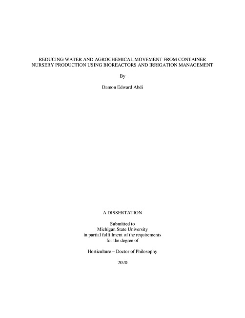 Container crop production is an input intensive agricultural sector, oftentimes demanding frequent, typically daily irrigation, substantial fertilizer use, and multiple pesticide applications throughout the production cycle. The combination of these factors increases the risk for agrochemical movement in irrigation return flow (IRF). Over the course of two studies, a model nursery designed to collect surface and subsurface IRF was used to investigate water use and agrochemical movement in a model nursery. An overhead control was compared to micro-irrigation (SS) and substrate volumetric moisture content (θ) sensor based overhead irrigation (OH) in the volume of water applied, volume of water lost to IRF, and associated fertilizer and pesticide content transported. Irrigating using OH and SS reduced the volume of irrigation applied by 49% and 78% compared to the control. Surface IRF was reduced by 80% using OH and was largely eliminated using SS; however, subsurface IRF was generally equivalent between the control and treatments. Surface IRF movement of nitrate and phosphate was reduced by 72% - 76% when irrigating using OH, and up to 98% when irrigating using SS. Pesticide mobility in irrigation return flow was reflective of pesticide physiochemical properties, with more soluble pesticides exhibiting greater movement than less soluble pesticides, particularly in subsurface IRF. OH reduced surface IRF movement of the 10 pesticides by 43-89%, while SS reduced surface IRF movement by 77-100%. There were typically no differences in subsurface IRF pesticide movement between the control and treatments. For all studied taxa (Cornus obliqua 'Powell Gardens', Cornus sericea 'Farrow', Hydrangea paniculata 'Limelight', Physocarpus opulifolius 'Seward', Rosa x'Meipeporia', Spiraea japonica 'SMNSJMFP', and Weigela florida 'Elvera') an equivalent growth index to the control was achieved when irrigating based on θ. Irrigation treatments were capable of producing an equivalent weight of shoot dry biomass for all taxa except C. obliqua, P. opulifolius, and S. japonica where the control was greater than all treatments. For the three species where root dry biomass was investigated (H. paniculata, R. x., and S. japonica), only S. japonica exhibited reduced root dry biomass under the OH and SS treatment compared to the control. Irrigating based on θ, regardless of the delivery method, can produce woody ornamental species of equivalent quality, while also reducing water use and agrochemical export in irrigation return flow; however, bioactive concentrations of agrochemicals may still be present. Woodchip bioreactors (WB) and adsorbent aggregate filters (AF) are treatment technologies that are capable of remediating or sequestering contaminants from IRF via biological and sorptive processes, provided a sufficient hydraulic retention time (HRT). A 72 hour HRT reduced over 99% of influent nitrate in WB and up to 87% of phosphate in AF; whereas, an HRT of 21 minutes was insufficient for nutrient remediation. An HRT of 21 minutes was effective in reducing the movement of bifenthrin, chlorpyrifos, and oxyfluorfen by 76%, 63%, and 31%, respectively, using WB. Microbial analysis of WB identified shifts in species composition when exposed to pesticides, enriching for a number of species within the Pseudomonas and Exiguobacterium genus, while decreasing the number and diversity of Bacillus species compared to the nutrient only control.