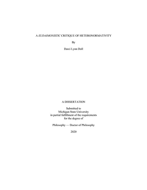 Aristotle argues in the Ethica Nicomachea that eudaimonia, or flourishing, is the chief human good. This chief good will be that towards which all human activity aims. Amongst the features that contribute to, and help maintain, the eudaimon life Aristotle includes philia, or friendship. Aristotle dedicates one-fifth of the Ethica Nicomachea to an explanation of philia and the conditions under which philia can occur. The three forms of philia are friendships for utility, pleasure, and character, or virtue, based. The virtue-based friendships, or primary friendships, is the ideal and contributes the most to eudaimonia. The attention to detail regarding philia in this work on ethics demonstrates that Aristotle views friendly relationships as playing an important role in the eudaimon life. In contrast, Aristotle pays little attention to relationships founded on eros, or erotic love. I argue that just as philia can contribute to the development and maintenance of eudaimonia, so too can eros. My argument, then, is that Aristotle, having a complete view of philia, fails to provide a complete account of eros. Eros, for Aristotle, is mainly a relationship for pleasure but may also be for utility. On my account, Aristotle ought to extend his view of eros to include primary relationships just as he does with philia. Furthermore, I argue that as Aristotle's view is heteronormative, it focuses on a problematic sex and gender binary. If the primary form of eros is applied, ideal erotic relationships will be those which are relationships founded on virtuous character, and not on sexual orientation or gender. In lieu of evaluating erotic relationships on problematic sex or gender binaries, we ought to focus on whether the relationships are virtuous. As such, I criticize heteronormativity and argue for a broadened approach to erotic relationships.