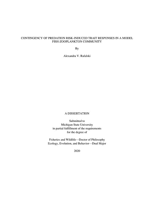 Predators affect prey populations both through consumption and by inducing antipredator trait responses. In the mere presence of predators, many prey modify traits in order to reduce their risk of being consumed. Predation risk-induced trait responses (hereafter 'trait responses') are numerous and universal across ecosystems and across different taxa, from protists to large mammals. Increasing attention is being given to the proposition that trait responses can have large effects on prey fitness, with ensuing effects on prey population growth and interacting species. A thorough understanding of the role of such predation risk effects is important for the ecological theory of basic properties such as resilience and biodiversity, and for ecological models used in natural resources management.While there are many studies that demonstrate a variety of trait responses in different taxa and examine the drivers of trait responses, it is still difficult to predict when trait responses will translate to population and community-level effects. The majority of theories and studies of trait responses have been conducted in simplified food webs such as predator-prey pairs. However, to examine the contribution of predation risk effects in addressing ecological questions, there is a need to understand how trait responses operate in larger food webs. To scale up from simplified systems, fundamental properties of populations and communities need to be considered including whether there is variation and contingency in trait responses among life history stages and similar species of prey. While there is a theoretical basis for expecting variation, empirical examples in a natural setting are lacking.My dissertation research empirically examines the variation and contingency of behavioral trait responses induced by a fish predator within a diverse assemblage of zooplankton prey. Experiments were conducted in mesocosms with and without fish kairomone (produced by caged fish); the effect of kairomone on the position of zooplankton is used as a measure of behavioral response. Chapter 1 examines variation in behavioral responses among life history stages of copepods. The responses were highly stage-dependent, with nauplii shifting in the opposite direction than copepodites and adults. Chapters 2 and 3 examine variation in cladoceran behavioral responses and assess if the expression and magnitude of responses is contingent on differences in predation risk among taxa. In trying to understand the variation in trait responses among prey, it might be expected that more vulnerable prey would exhibit larger trait responses. Such positive relationships between trait responses and predation risk have been exhibited in some systems. We compared the relationship between behavioral responses and metrics of predation risk across cladocerans. Metrics included relative predation rate and net effect of the predator on density on each taxon (measured from a treatment with uncaged fish) as well as cladoceran body size and taxonomic identity (family). While cladocerans exhibited strong variation in behavioral responses, we did not find larger trait responses in more vulnerable prey.Taken together, the chapters within this dissertation demonstrate there can be considerable variation in trait responses among prey and reinforces the complex nature of factors underlying trait responses. Explicit consideration of variation in trait responses and trade-offs that govern them can lead to better insight when scaling up the study of predation risk effects and their incorporation into models.
