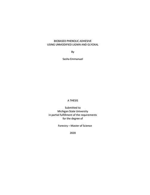 Phenolic adhesives, primarily made of petroleum-based phenol and formaldehyde, have been used for many decades to manufacture wood composites such as plywood and oriented strand board (OSB) due to their superior performance. Phenol and formaldehyde are both made of fossil-fuel chemicals, and formaldehyde's toxicity and carcinogenic activity caused many researchers to focus on finding ways to replace it with biobased, less toxic raw materials. This study was focused on using lignin, a natural plant-based polymer, to replace phenol and used glyoxal, a biobased non-toxic chemical, to replace formaldehyde. The phenol was entirely replaced with an unmodified enzymatic hydrolysis corn stover lignin, while at the same time formaldehyde was substituted from 0 to 100% in increments of 10 with glyoxal. The resins were formulated under alkaline conditions using lignin to formaldehyde and/or glyoxal with a 1:2 molar ratio. The property and performance of resins and adhesives were measured and compared to a phenol-formaldehyde (PF) adhesive formulated in the lab. The pH, alkalinity, solid-content, free formaldehyde content of the formulated adhesives was similar to a commercially available PF adhesive. The dry lap shear strength of the developed lignin-glyoxal (LG) adhesive was 3.3 ± 0.4 MPa, which was comparable to the dry adhesion strength of the laboratory formulated PF adhesive (3.4 ± 0.2 MPa).