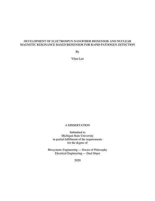 Water and food contaminated with pathogens cause millions of hospitalizations and thousands of deaths, and costly recalls in food and retail industries annually. Among them, the Shiga Toxin-producing Escherichia coli (STEC) causes foodborne outbreaks every year, which leads to more than 265,000 illnesses, 3,600 hospitalizations, and 30 deaths in the United States alone. Currently approved detection methods, such as culturing and colony counting, or polymerase chain reaction (PCR), provide accurate diagnosis. However, these methods require long detection time (ranging from 6 to 24 hours), high testing cost, large-sized equipment, and/or skilled personnel, limiting their application in controlling outbreaks, reducing recall loss, or on-field diagnosis in developing countries. In this dissertation research, two biosensors were developed based on electrospun nanofiber and nuclear magnetic resonance (NMR) for rapid detection of STEC with high sensitivity. The electrospun biosensor was designed as lateral-flow immuno-sensor based on magnetic nanoparticles (MNPs) and electrospun nanofibers. The MNPs were coated with conductive nano-shells and functionalized with antibody to extract target pathogen by immunomagnetic separation. Biocompatible nanofibrous membrane was synthesized by electrospinning technique, which was optimized for nano-porous structure and excellent capillary properties. The electrospun membrane was functionalized with antibody to capture the MNP-pathogen conjugates by lateral-flow separation. As a result, the membrane’s conductivity was proportional to pathogen concentration, which could be measured by a portable impedance analyzer. Owing to the novel nanostructure, the surface area and mass transfer rate were significantly increased. This improved the biochemical binding effect and sensor signal to noise ratio. The biosensor’s sensitivity limit was 61 colony forming units per milliliter (CFU/mL) and 104 cell culture infective dose per milliliter (CCID/mL) for bacterial and viral samples, respectively, with detection time of 8 min. The electrospun biosensor has advantages of low cost and high sensitivity, which can be used for on-field biodefense and food safety applications. In the second work, a portable nuclear magnetic resonance (pNMR) biosensor was developed based on antibody functionalized MNPs as proximity biomarkers of the pathogen, which induced micro-magnetic variation to accelerate NMR resonance signal decay. The pNMR was designed using a hand-held magnet of 0.47 Tesla, a high-power radio frequency (RF) transmitter, and an ultra-low noise receiver capable of detecting 0.1 μV NMR signal. The pNMR biosensor assay and sensing mechanism was used in detecting E. coli O157:H7, and sensitivity limit was 76 CFU/mL in water samples and 92 CFU/mL in milk samples with detection time of 1 min. The pNMR biosensor is innovative for bacterial detection in food matrices and can be extended to other microbial or viral organisms by changing the antibody specificity. Besides, the pNMR biosensor can be used for on-field healthcare diagnostic and biodefense applications owing to its advantages of portability and speed of detection.