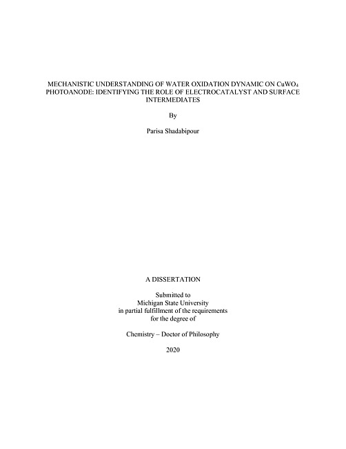 Copper tungstate (CuWO4) has been realized as a promising photoanode material for driving oxygen evolution reaction (OER), also called water oxidation, a half-reaction of water splitting. It has been shown that surface state recombination limits the performance of the CuWO4 for photoelectrochemical (PEC) water oxidation. The integration of an electrocatalyst with a semiconductor photoanode is a well-adopted approach to eliminate surface recombination and improve the efficiency of water oxidation process. Unlike most demonstrated photoanodes for OER, the integration of an electrocatalyst with a CuWO4 electrode has been observed to be usually detriment, or at most, do not affect the photocatalytic water oxidation activity of this material. Because the interfacial processes control the overall reaction, unraveling the dynamic of the interface is an essential step for the principle design of the electrocatalyst for enhanced PEC water oxidation on CuWO4 photoanode. In this dissertation, I am seeking to gain a fundamental understanding of the role of surface states as well as the influence of electrocatalysts on the behavior of CuWO4 thin-film electrodes for PEC OER. Here we present results that deepen the understanding of the energetics and electron-transfer processes at the CuWO4/electrolyte and CuWO4/electrocatalyst interfaces, which controls the performance of such systems. Ni0.75Fe0.25Oy was chosen as a model electrocatalyst to investigate the CuWO4/electrocatalyst interface due to the high electrocatalytic activity. Through dual-working electrode experiments, current transient, and impedance spectroscopy measurements, we have been able to gain significant insight into the role of the electrocatalyst and the electron-transfer at the CuWO4/electrocatalyst interface. Our results indicate that the lack of efficiency improvement after deposition of electrocatalyst on CuWO4 is due to water oxidation on the CuWO4 surface kinetically outcompetes the electrocatalyst oxidation. Thus, water oxidation occurs primarily from the CuWO4 surface rather than the electrocatalyst. For the investigation of the role of CuWO4 surface states, we employed the operando ATR-IR spectroscopy under PER OER condition. Our results show growing of absorption peaks at 750 and 1100 cm-1, which can be attributed to the formation of surface oxo and superoxo water oxidation intermediates on the CuWO4 surface, respectively.