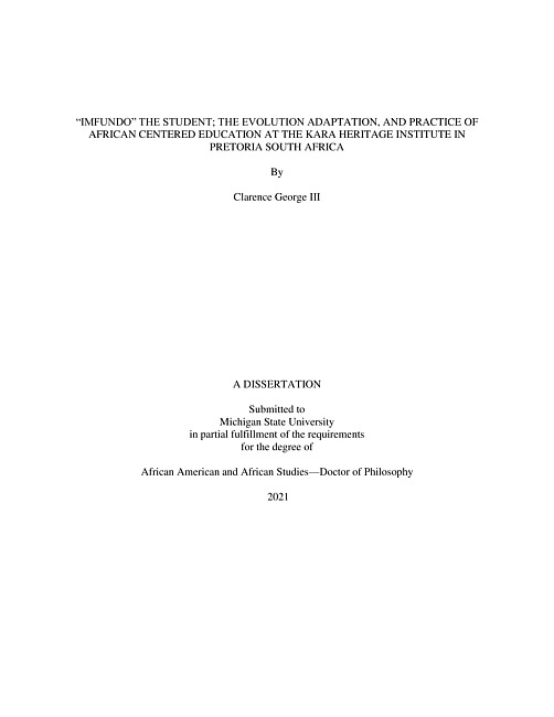 ABSTRACT“IMFUNDO” THE STUDENT; THE EVOLUTION ADAPTATION, AND PRACTICE OF AFRICAN CENTERED EDUCATION AT THE KARA HERITAGE INSTITUTE IN PRETORIA SOUTH AFRICAByClarence George III This dissertation study (Imfundo) seeks to explore, the practice and evolution of African centered education at the Kara Heritage Institute from 2016 to 2019. This project seeks to study African centered education at Kara focusing on how the Heritage Institute instills notions of African consciousness, notions of Pan-Africanism, structural pedagogy, and culturally relevant pedagogy. This research project evaluated and observed African-centered education in South Africa at the Kara Heritage institute in Pretoria South Africa. Over 4 years of data collected has yielded a great deal of information about South Africa's unique approach to education, culture, and heritage restoration.