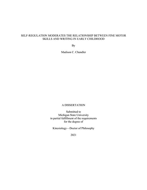 Learning to write is challenging for young children, as they must integrate their still-developing fine motor skills with an understanding of written language to produce a mark that has meaning. Complicating things more is the fact that children are often asked to produce a variety of written products with varying task demands (e.g., writing single letters vs. combining these letters to form entire words or sentences). Although theoretical models of writing highlight the importance of both self-regulation and fine motor skills for writing, our current understanding of how these two constructs interact to support writing remains incomplete. Thus, this dissertation examined the extent to which self-regulation moderates the relation between fine motor skills and early writing development – and whether this relation differs by writing task difficulty. To address this, two diverse cross-sectional samples of 3-5-year-old children from Head Start programs were assessed on motor skills, self-regulation, and a variety of writing tasks at the beginning (N = 333) and end (N = 405) of the preschool year. Hierarchical regression analyses were conducted to examine the potential moderating association between fine motor skill and self-regulation on early writing skills, with separate models fit for each writing task. After controlling for demographic factors, results indicated that self-regulation was important at the beginning of the year for children with higher levels of motor skills when completing a challenging writing task. Self-regulation was also important at the end of the school year for both 1) children with lower motor skills, but only for the simpler writing tasks, and 2) for children with higher motor skills on the more-challenging writing tasks. Findings suggest that the relation between self-regulation and writing is dependent upon task difficulty, and that self-regulation and motor skills may compensate for deficits in one or the other skill when children perform writing tasks.