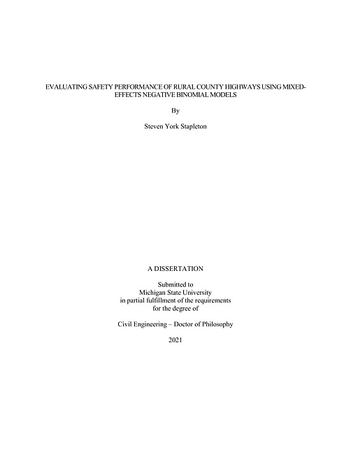 Safety on rural highways continues to be a serious concern in the United States. While only 20 percent of the population live in rural areas, approximately one-half of motor vehicle fatalities occur on rural roadways, resulting in a rural fatal crash rate that is approximately double that of urban areas. In many states, most rural arterial highways are owned by the state department of transportation. However, several states, including Michigan, possess a large rural county highway network. For example, nearly 75 percent of the approximately 120,000 miles of public roadways in Michigan are owned by one of the 83 county road agencies across the state.County-owned highways typically possess characteristics that differ considerably from those owned by the state department of transportation, which limits the usefulness of safety performance functions (SPFs) and crash modification factors (CMFs) generated based on state highways, including those found in the Highway Safety Manual (HSM). Thus, assumptions made from models generated using data from state highways may not apply county highways due to differences in traffic, design, and maintenance. As a substantial proportion of rural crashes occur on county roads, identification of factors affecting safety performance on rural county roads is critical to support highway safety improvement programs and development of design standards.A cross-sectional safety performance analysis was performed for county highway segments and stop-controlled intersections throughout rural Michigan, including both federal aid and non-federal aid highways, as well as paved and unpaved road surfaces. SPFs were developed using mixed effects negative binomial regression to determine the safety effect of various design elements and site characteristics, including cross-sectional and geometric characteristics, which were included in the models as fixed effects. Random intercepts were incorporated into the models to account for unobserved heterogeneity between counties and between individual sites.One particularly noteworthy contribution of this research was to investigate the impacts of horizontal curvature on safety performance. Curve radii data extracted from the Michigan roadway shapefile allowed for the safety performance effects of decreasing curve design speed to be assessed in an incremental manner. Horizontal curves on paved county roads with design speeds below 40 mph experienced crash occurrence that was more than four times greater than segments without substandard curvature. On unpaved roadways, such curves experienced three times greater crash occurrence compared to segments without substandard curvature. Deer-related crashes, however, were shown to be fewer in frequency along horizontal curves.For stop-controlled intersections, skew angle was a variable of interest. At rural four-leg stop-controlled intersections, skew angles between 10 and 39 degrees were associated with increased crash frequency at intersections across all intersection classes. Skew had the greatest effect when the major road was county non-federal aid, where skew angles between 10 and 39 degrees experienced 60 percent more crashes than intersections without skew. Considering federal-aid intersections, the skew effect was diminished by approximately one-half.As expected, county-specific SPFs differed from models previously developed for state highways, including the SPFs included in the HSM. Generally speaking, at intersections, county highways were found to experience fewer crashes per unit of traffic volume than state highways, with county non-federal aid highways showing the lowest crash occurrence. County highway segments tend to have higher crash frequency than state roads. However, this is not the case at all traffic volumes, which further shows the need for county-specific safety performance models.
