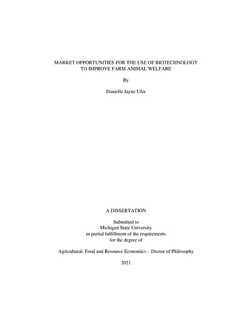 Novel biotechnologies offer an avenue to improve farm animal welfare but face several potential challenges in the market. Consumers are demanding stricter animal welfare standards in livestock production but are wary of biotechnology applications in food and agriculture. This dissertation explores the market opportunities for biotechnology and animal welfare improvements in the pork and dairy industries. I take a comprehensive approach, employing experimental methods to investigate consumer receptivity to products with biotechnology and animal welfare traits; and producer intent to adopt such technologies into their operations.The first chapter explores the economic foundations, challenges, and opportunities for consumer acceptance of biotechnology applications in animal welfare, especially gene editing techniques. I review the food economics literature on consumer acceptance of biotechnology to improve animal welfare and discuss the emerging opportunities for future improvements through gene editing. I also discuss industry and policy implications of consumer demand for animal welfare and biotechnology in livestock applications. One of the first challenges at the nexus of biotechnology and animal welfare is effective communication between producer and consumer. Product labels communicate valuable traits to consumers but, when a single label represents multiple traits, communication can be hindered by consumer misinformation. The second chapter addresses the emerging phenomenon of redundant labels, which can address misinformation by explicitly indicating included qualities within a comprehensive label. I utilize data from a field experiment on willingness to pay for redundant labels in the U.S. organic fluid milk market when consumers are either uninformed or informed of the redundancy. Market share simulations demonstrate the market impacts and effectiveness of introducing a redundant label as a response strategy to recapture market share lost to increasingly prevalent individual labels. The third chapter also employs a field experiment and investigates the market viability of novel biotechnology applications that improve animal welfare. I evaluate U.S. consumer demand for pork produced using two animal welfare-improving biotechnologies – immunocastration and gene editing. Results indicate negative attitudes toward biotechnology outweigh animal welfare benefits, though products still garner a slight average premium due to heterogeneity in preferences. Findings support policies that balance regulatory approval costs with observed market acceptance and policies that provide for animal welfare demands. Market opportunities are dictated by all decision-makers in the market, including both consumers and producers. The complexities of the decision to adopt gene-editing technology at the farm gate are likely to be greater than a simple matter of profitability. In the final chapter, I investigate ex-ante technology adoption intent to address how non-pecuniary motivations influence a dairy producer’s decision to adopt gene-editing technology with animal welfare-improving benefits. This chapter extends random utility theory to account for situational influences on producer decision outcomes. I employ the experimental vignette methodology, and a random parameters ordered logit modeling approach. Findings point to a general resistance among dairy farmers towards gene-edited genetics, even with an animal welfare-improving application. Farmers can, however, become more amenable to the prospect of adopting gene-edited genetics through situational influences.