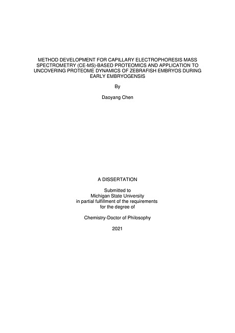Reversed-phase liquid chromatography (RPLC) coupling with tandem MS (MS/MS) is often the method of choice in both peptide-centric bottom-up proteomics (BUP) and proteoform-centric top-down proteomics (TDP) studies. In recent years, capillary zone electrophoresis (CZE)-MS has attracted attention as another platform in proteomics due to high separation efficiency, high sensitivity, and complementarity to LC-MS. This work is dedicated to developing novel CE-MS-based methods for large-scale proteomics and applies them to study the proteome dynamics of zebrafish embryos during early embryogenesis.In Chapter 2, a sample stacking method, dynamic pH junction, was systematically investigated and employed to improve CZE’s sample loading capacity for large-scale BUP. The results of the optimized system represent the highest loading capacity, the highest peak capacity, and the widest separation window of CZE for peptide separation to date. The automated CZE-MS system opened the door to using CZE-MS for large-scale BUP. In Chapter 3, for the first time, a strong cation exchange (SCX)-RPLC-CZE-MS/MS platform was established for deep BUP and phosphoproteomics. The platform approached comparable performance to the modern 2D-LC-MS/MS for deep proteomic sequencing evident by identifying 8200 protein groups and 65,000 unique peptides from a mouse brain proteome digest, 11,555 phosphopeptides from the HCT116 cell line. SCX-RPLC-CZE-MS/MS and 2D-LC-MS/MS showed good complementarity in protein, peptide, and phosphopeptide IDs. In Chapter 4, a quantitative BUP study was performed on zebrafish embryos across four developmental stages during the maternal-to-zygotic transition (MZT) via coupling isobaric tag for relative and absolute quantitation (iTRAQ) chemistry with both RPLC-MS/MS and CZE-MS/MS. Expression kinetics of nearly 5000 proteins including over 100 transcription factors (TFs) across four early embryonic stages were determined. The protein expression profiles fall into several different clusters and accurately reflect the important events during early embryogenesis. Further studies of the expression profiles of TFs revealed that the differentially expressed TFs during the MZT show wave-like expression patterns. Top-down proteomics (TDP) aims to directly characterize proteoforms in cells. CZE-MS/MS has been demonstrated as a useful tool for TDP. In Chapter 5, for the first time, we evaluated various semiempirical models for predicting proteoforms’ electrophoretic mobility using large-scale TDP data sets from earlier CZE–MS/MS studies. Linear correlations were achieved between the experimental and predicted μef of E. coli proteoforms and histone proteoforms (R2 = 0.98), demonstrating that the μef of proteoforms in CZE-MS can be predicted accurately, which could be useful for validating the confidence of proteoform IDs from a database search. In Chapter 6, we concluded the results of this dissertation and provided our expectations for future studies.